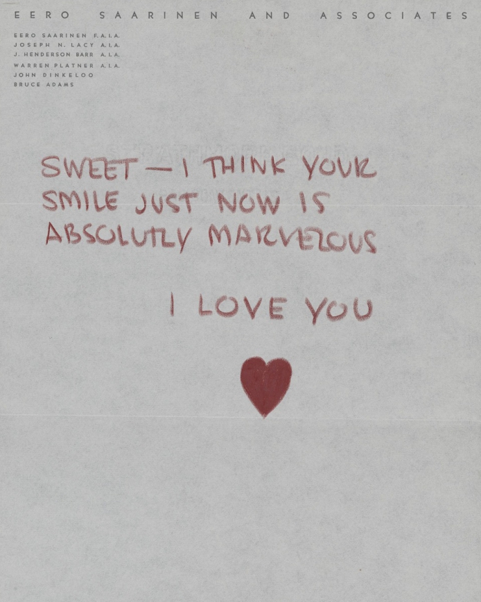 Aline Saarinen née Bernstein (1914 – 1972) was a successful journalist when she first met architect and designer Eero Saarinen (1910 – 1961). A graduate of Vassar College and New York University she was associate art editor and critic at The New York Times. In 1953 she was sent to visit Saarinen’s acclaimed General Motors Technical Center and interview the architect himself. It seems they were almost instantly smitten. A vast trove of correspondence between the two has been archived and letters immediately following the interview begin the flirtation. The pair married the following year, with Aline leaving the NYT citing her inability to continue to remain objective when she was finding herself “ardently promulgating the Eero-myth”. She went to work at Saarinen and Associates as Head of Information Services. Her role there formed a large part of their egalitarian relationship, seemingly at odds with the times. Evidence of this can be seen through their letters and a number of romantic and intimate notes sent to each other throughout their courtship and marriage.
