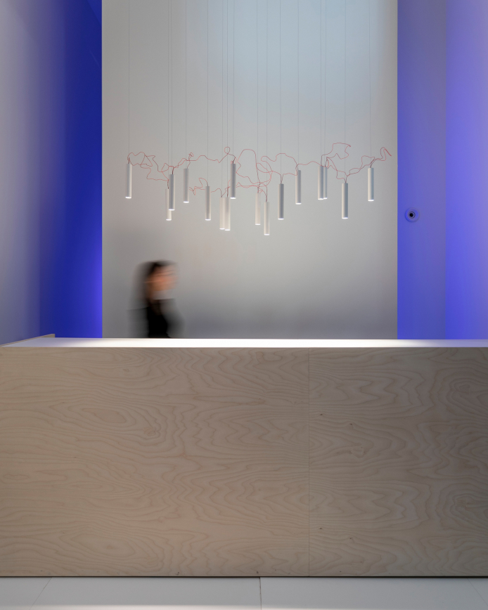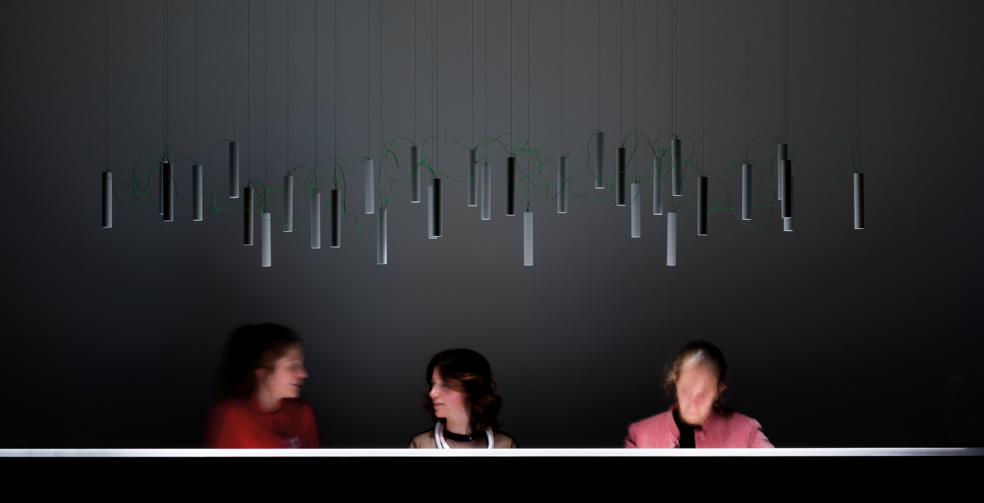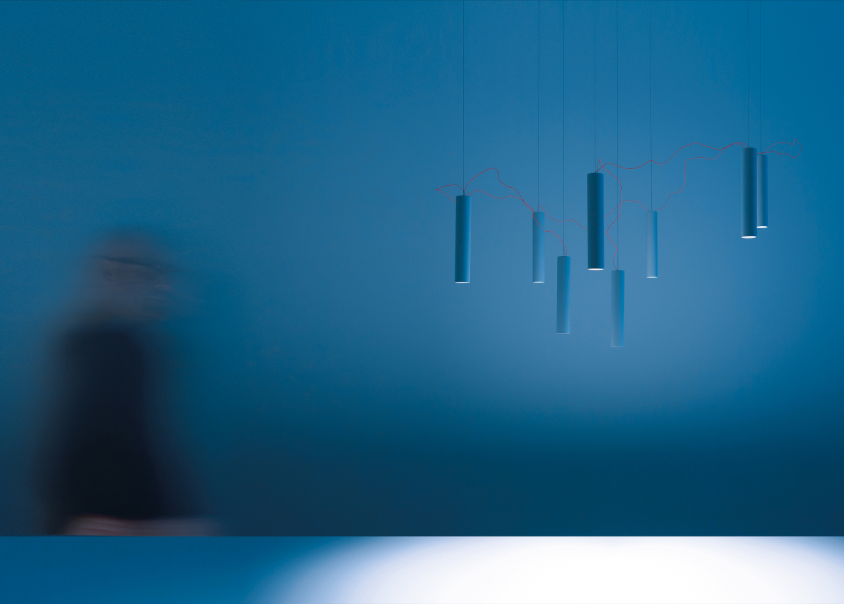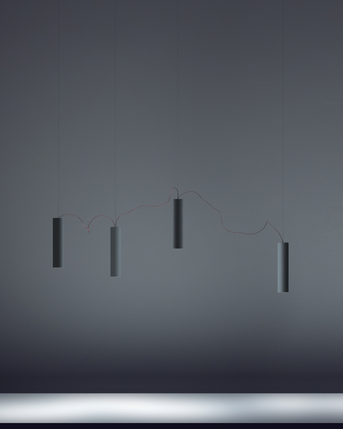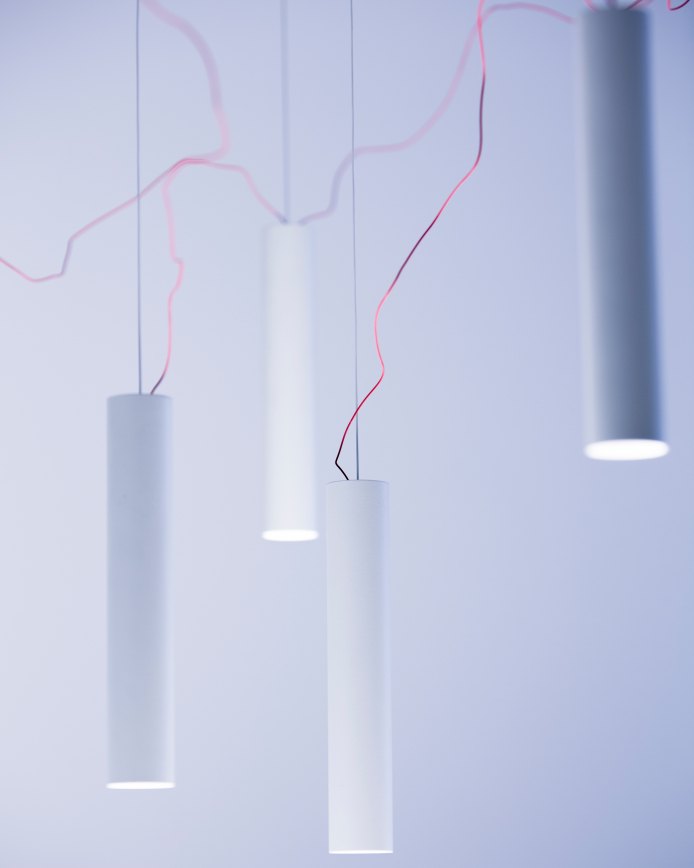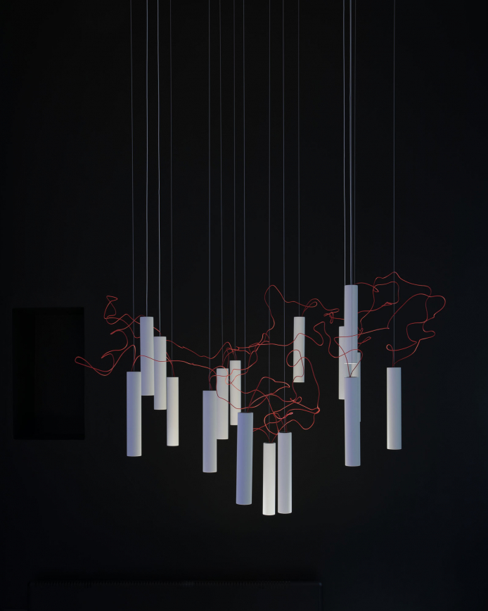 Simbiosi re-thinks the chandelier, de-structured it can be re-assembled to the taste of the user. Very thin red wire connects the light sources and brings them alive, one in relation to the other. As a whole, it appears weightless and almost inconceivable.