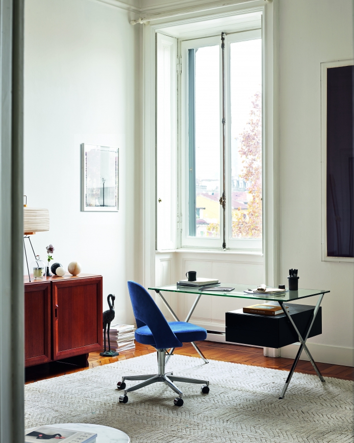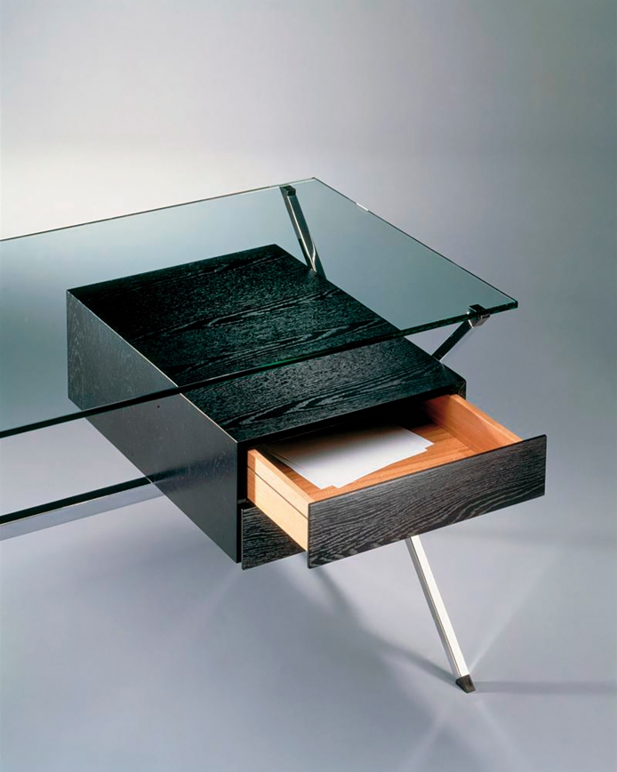 A minimal, timeless desk. The Albini desk is a compact size, with 'floating' 2-drawer module with open rear shelf for books or magazines.