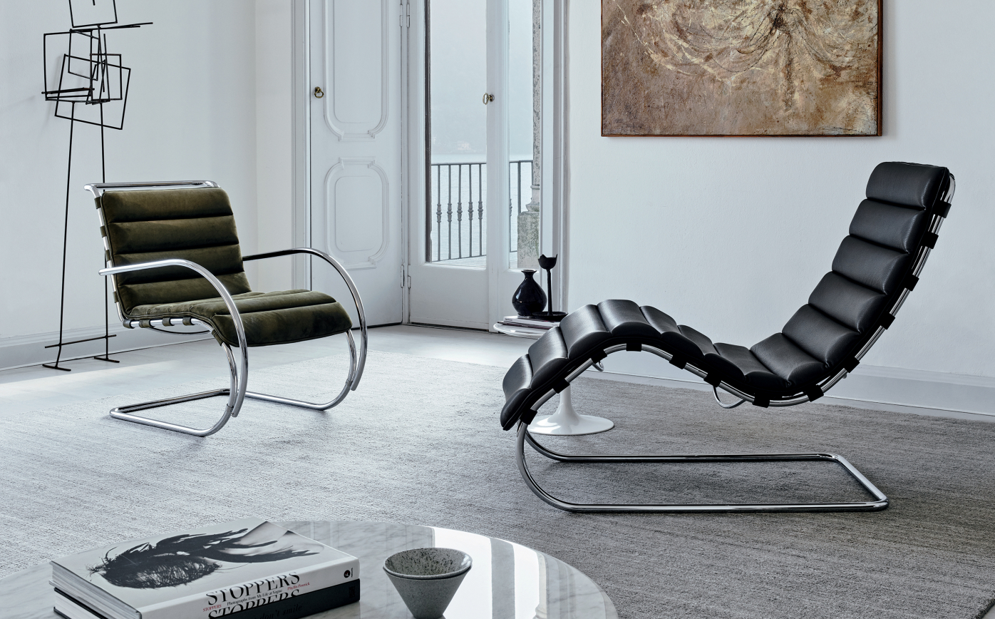 MR Lounge Armchair with polished chrome tubular steel frame and black cowhide upholstery straps.