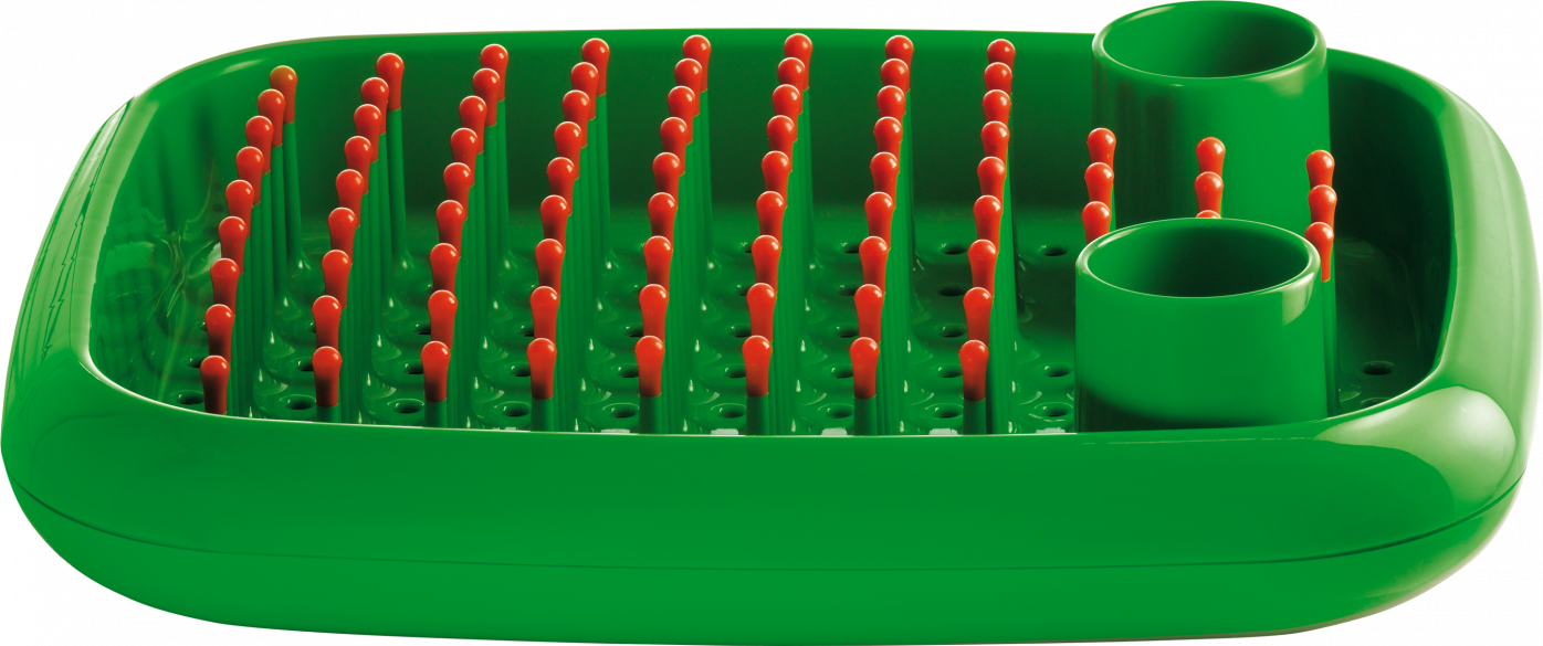 Even a domestic activity such as washing the dishes can be approached with an original, colourful, playful spirit, thanks to Dish Doctor: a draining rack created by combining two rounded polypropylene shells. Its shape is reminiscent of a ship, with two cutlery holders for funnels. Inside, a forest of round-tipped spikes keep the tableware in order after rinsing.