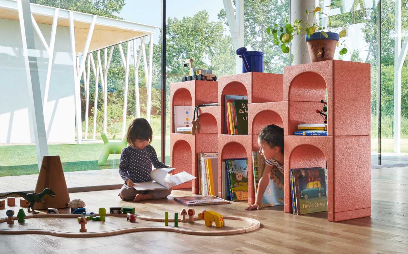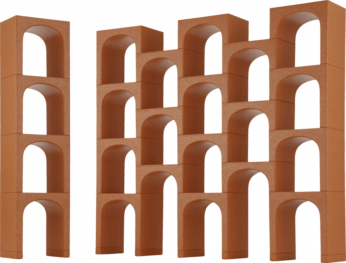 Elements in expanded polypropylene are stacked and adjoined to compose a shelving system, creating a series of superimposed arches.