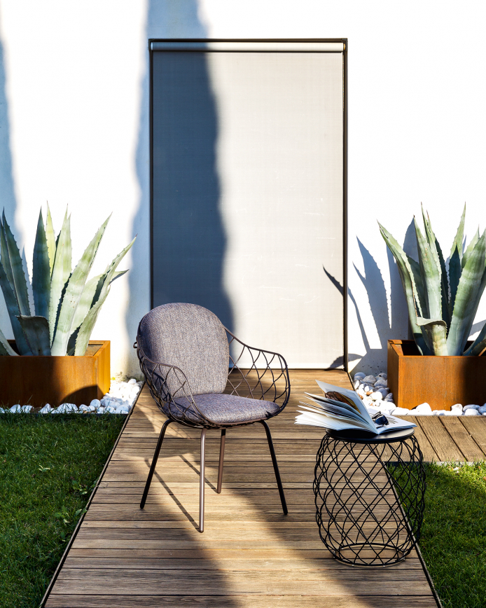 The Piña collection includes a comfortable low chair with footrest, a handy table and an amusing rocking chair. Suitable also for outdoor use, the Piña collection is rendered even more versatile by the choice of different finishes, perfect for every style and setting.
