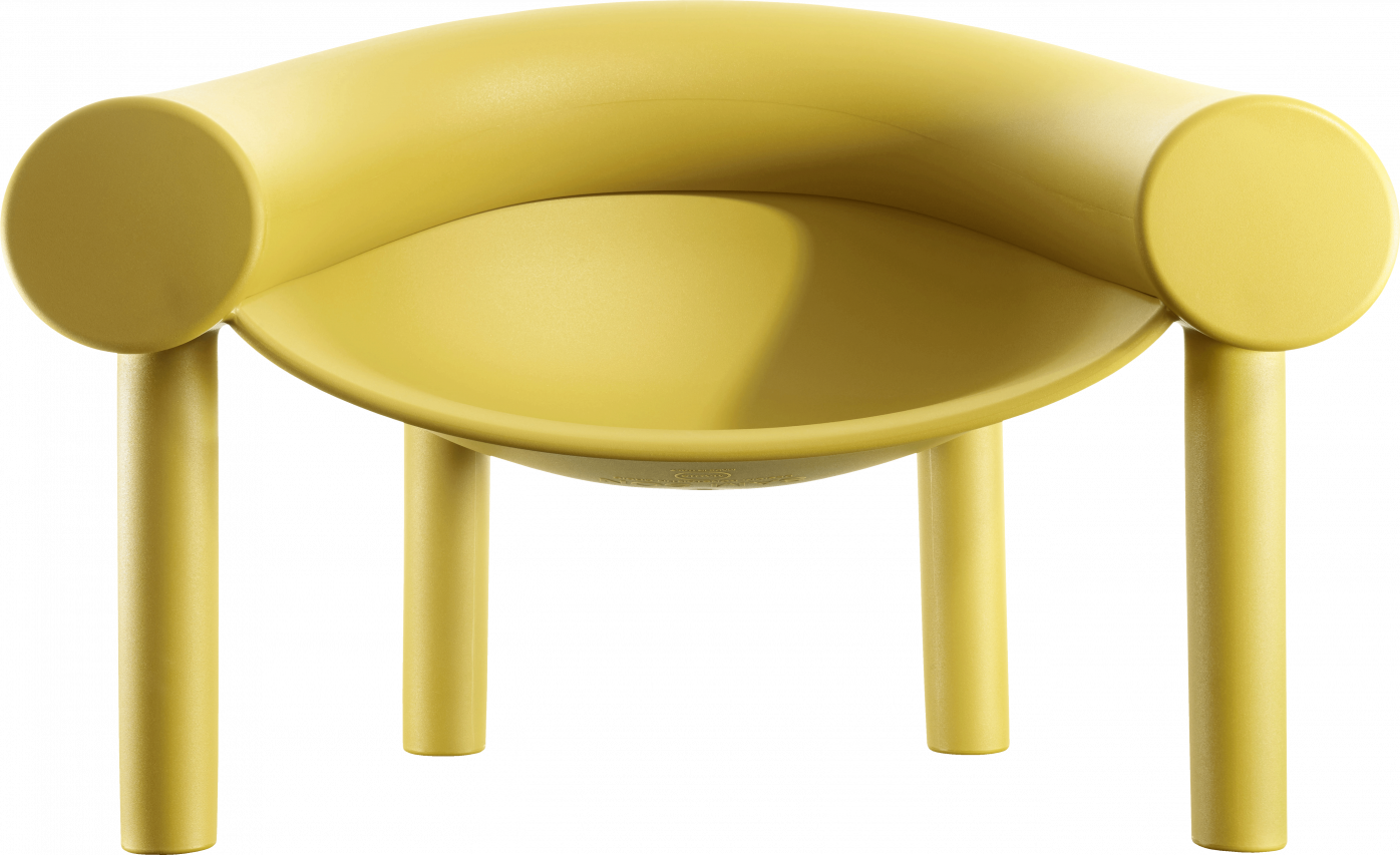 Sam Son is an easy armchair with a hint of a cartoon character. Supported on four stilt legs, the armchair features a softly suspended seat shell between a giant, horseshoe-shaped element, the chair's characteristic armrest and backrest. Made from two different rotational mouldings, the armchair combines a rigid plastic for its base and a more elastic polymer for the upper part. The exaggerated size of the armrest and backrest provides comfort and support and creates a protective space for sitting. Sam Son comes in four different colours and is suitable for both indoors and outdoors.