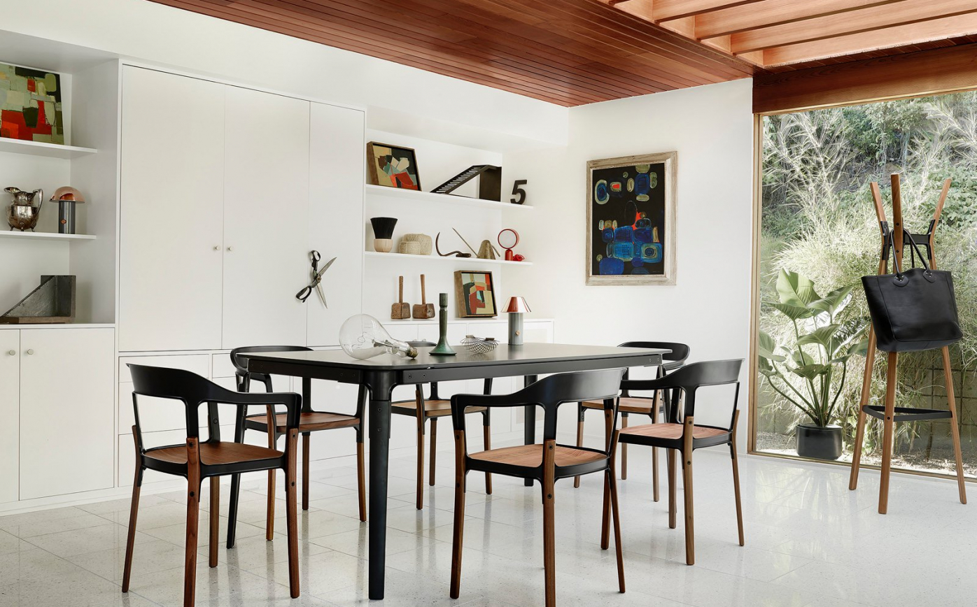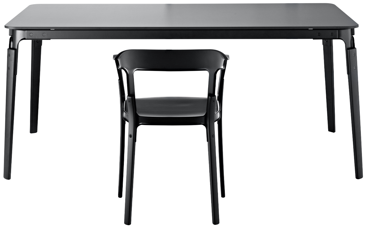 Steelwood Tables are durable and handsome at the same time—a necessity in offices, public places, and homes. The Steelwood Table combines the warmth of wood with the strength of steel, and pairs well with any chair, but especially with Steelwood chairs and stools. Legs and crosspieces are available in solid wood with resin-painted steel joints. Tops are laminate and come in several finish options.