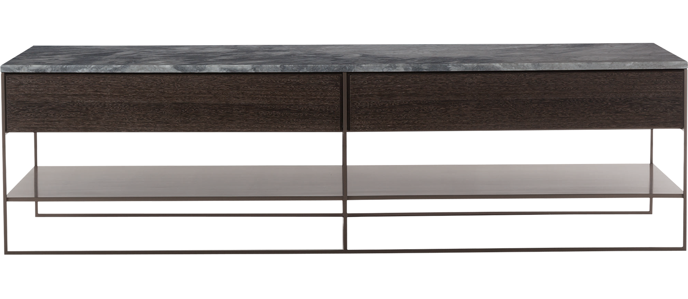 Several new versions of the top are also available: glossy lacquered Sand, Sucupira veneer stained Mink color, and Bardiglio Nuvolato or Calacatta marble. The under shelf is also in satin finish metal painted Light Bronze.