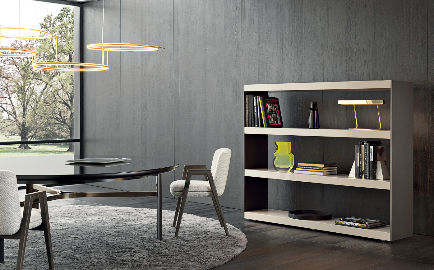 The collection of Carson cabinets, with its pure, modern aesthetic, gains two new elements – a bookcase and a desk – as well as a new ebony glossy lacquer polyester finish.