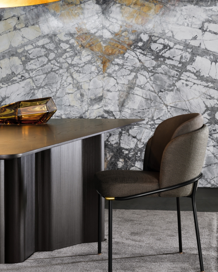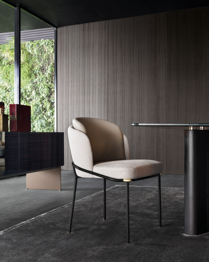 The Fil Noir chair has the same elegant design and enveloping shape as the eponymous armchair. A little armchair that beautifully blends formal elegance and great comfort, thanks to its metal and polyurethane foam structure. A cushion made of flexible thermoformed material and polyurethane foam lends additional softness to the backrest.