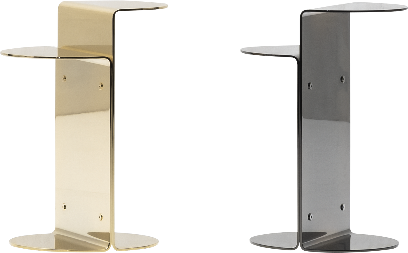 Designed as a jewel-sculpture, with its metallic glints, the Flirt coffee table adds a bright touch to interiors. The structure, made entirely from a sheet of polished stainless-steel, is bent to form two “C”s facing one another, offering two semi-circular tops on different levels.