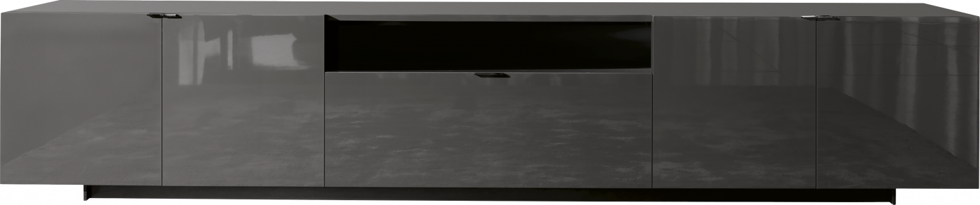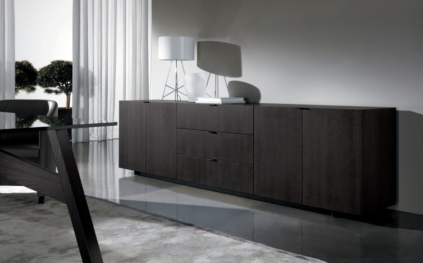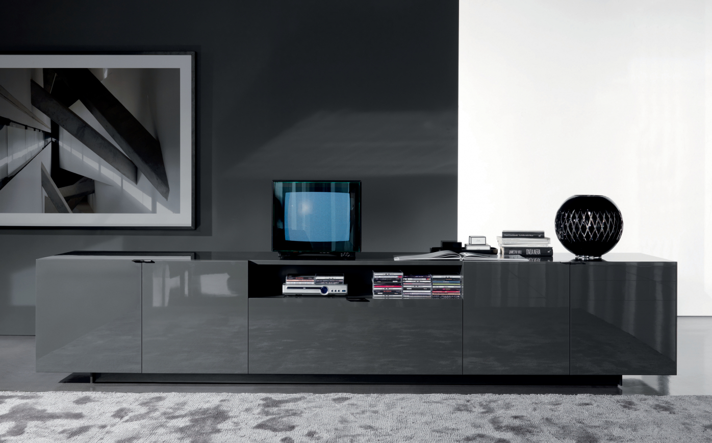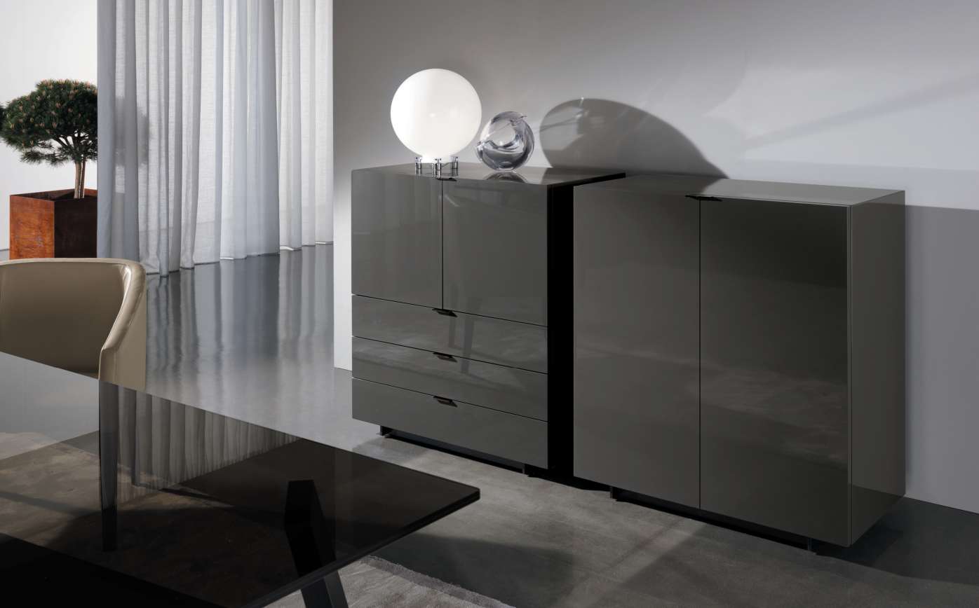 Material : Wood doors 30 mm in thickness, with built-in metal handles; Black-Nickel finish. Smoked Grey glass shelf, 10 mm in thickness, for modules with doors.
