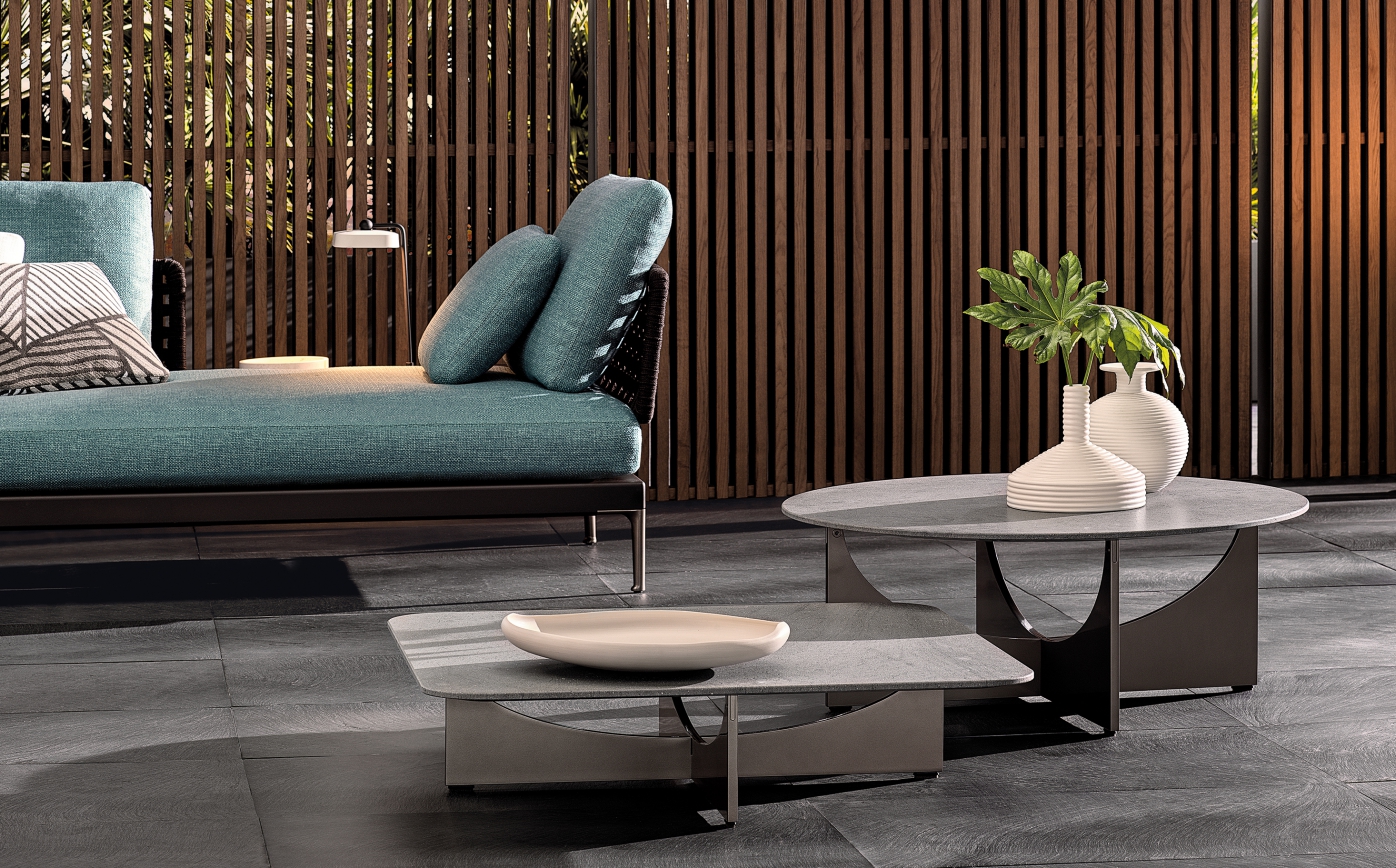 The Lido family perfectly expresses Minotti’s desire to create a single design for different environments, indoors and outdoors. Sitting on a distinctive X-shaped base, the coffee tables come in four sizes and two heights, with circular or square top in brushed, fine-grain Basaltina stone. Inspired by the 1950s the family includes sofas, armchairs, dining chairs and footstools.