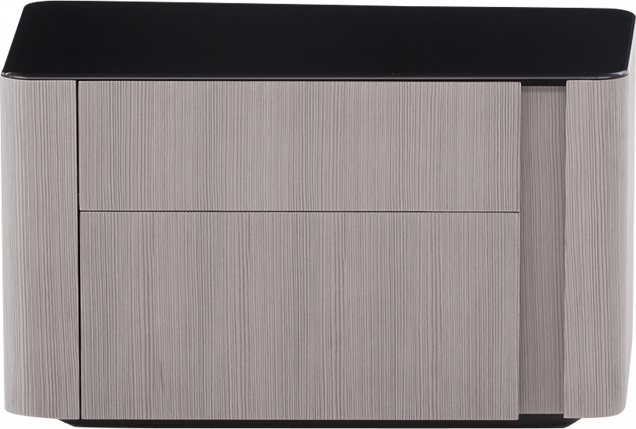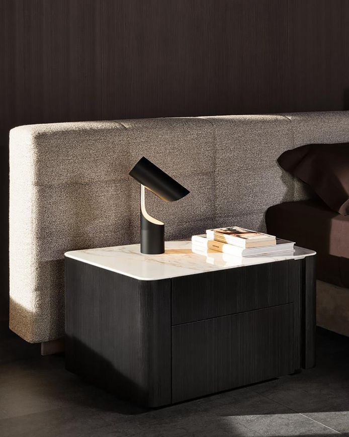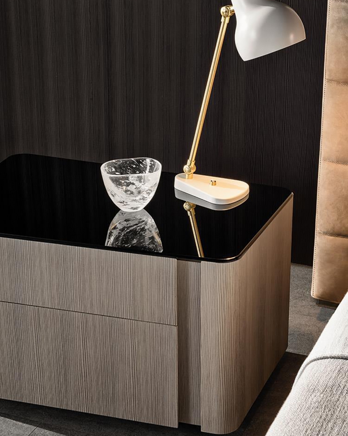 The Lou bedside table has a larch veneer structure and comes in pre-finished Dove Grey or with open-pore lacquer finish in Licorice colour. The flush-set tops are made of Calacatta marble and black pâte de verre.