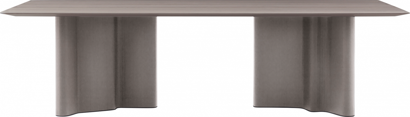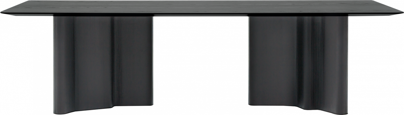Powerfully expressive, this family of tables and coffee tables draws inspiration from the fluid, organic shapes of tree trunks, true sculptures produced by nature. A masterful technique of high-end cabinetry made the creation of extremely complex curves and veneers possible. The contoured internal structure is in MDF, sheathed in larch veneered plywood which is then milled along the curved edges. The larch base in prefinished Dove Grey and Licorice lacquer can be paired with tops in the following finishes: open-pore stained ash in Dove Grey or Licorice colour. The underside has a matt finish in the same colour as the top, in Smoked Glass laminated to extra-clear or Amber colour glass. The 150 cm diameter top is also available in Calacatta marble.