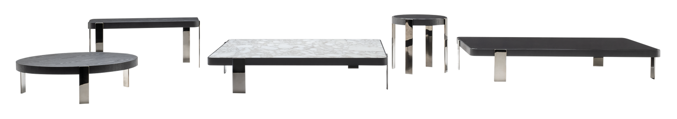 The ensemble is completed by a series of round, rectangular and square coffee tables in different sizes and heights, available in three versions: with top in Calacatta marble or black pâte de verre - inserted in a frame in brushed ash wood featuring a Liquorice colour laquered finish - or entirely in brushed ash wood with Liquorice colour lacquered finish.