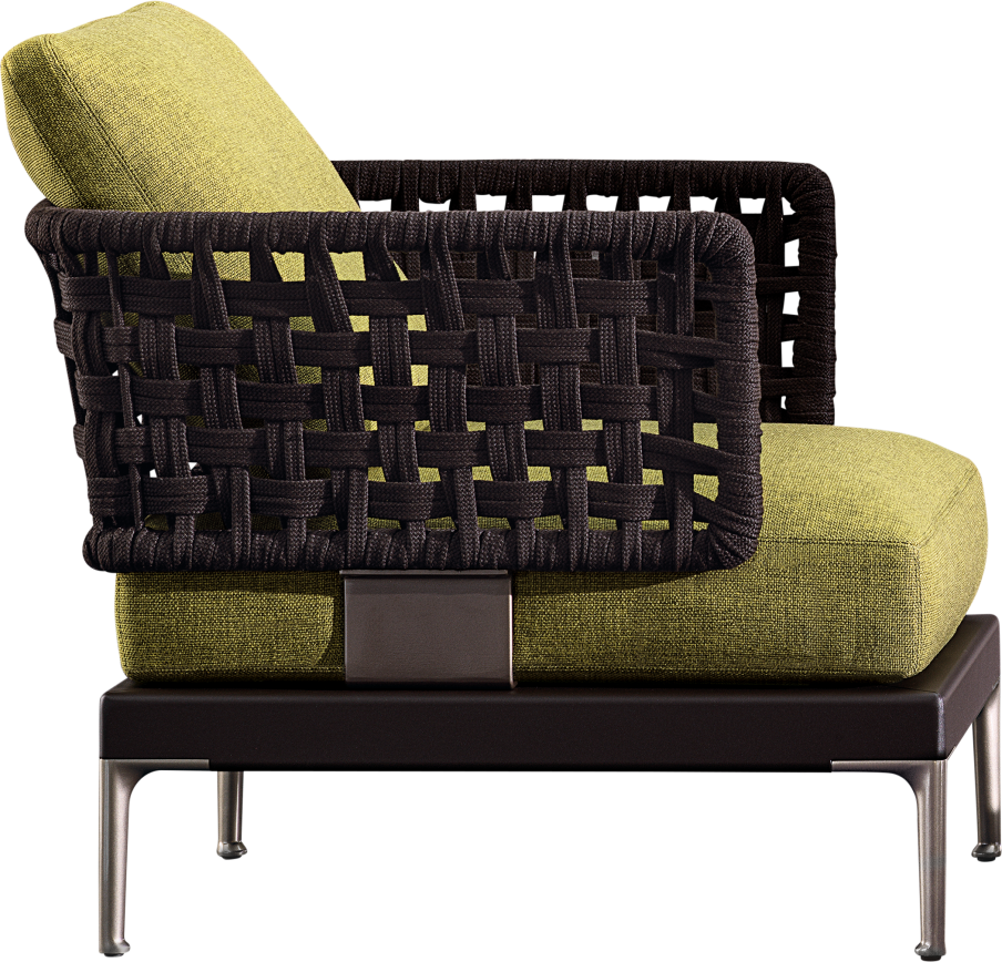The Patio collection is conceived as a dynamic mosaic, composed of simple geometric shapes, which can be pieced together as desired, and reconfigured to suit the available space and the mood to be created. The variety of potential compositions becomes even more interesting when the selected materials are masterfully combined: aluminium, wood, stone, cord. The collection includes a sofa system with offers a rich variety of sofas in different measurements and configurations, in addition to central and end units, armchairs, loveseat, and double daybeds as well as coffee tables with tops in brushed fine-grain Basaltina stone, benches, and square and rectangular ottomans.
