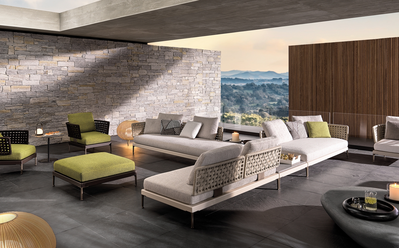 The Patio collection is conceived as a dynamic mosaic, composed of simple geometric shapes, which can be pieced together as desired, and reconfigured to suit the available space and the mood to be created. The variety of potential compositions becomes even more interesting when the selected materials are masterfully combined: aluminium, wood, stone, cord. The benches in collection matching varnished aluminium frames, either fully upholstered or with inbuilt coffee table in brushed fine-grain Basaltina stone. The collection includes a sofa system with offers a rich variety of sofas in different measurements and configurations, in addition to central and end units, armchairs, loveseat, and double daybeds as well as armchairs, coffee tables, and square and rectangular ottomans.
