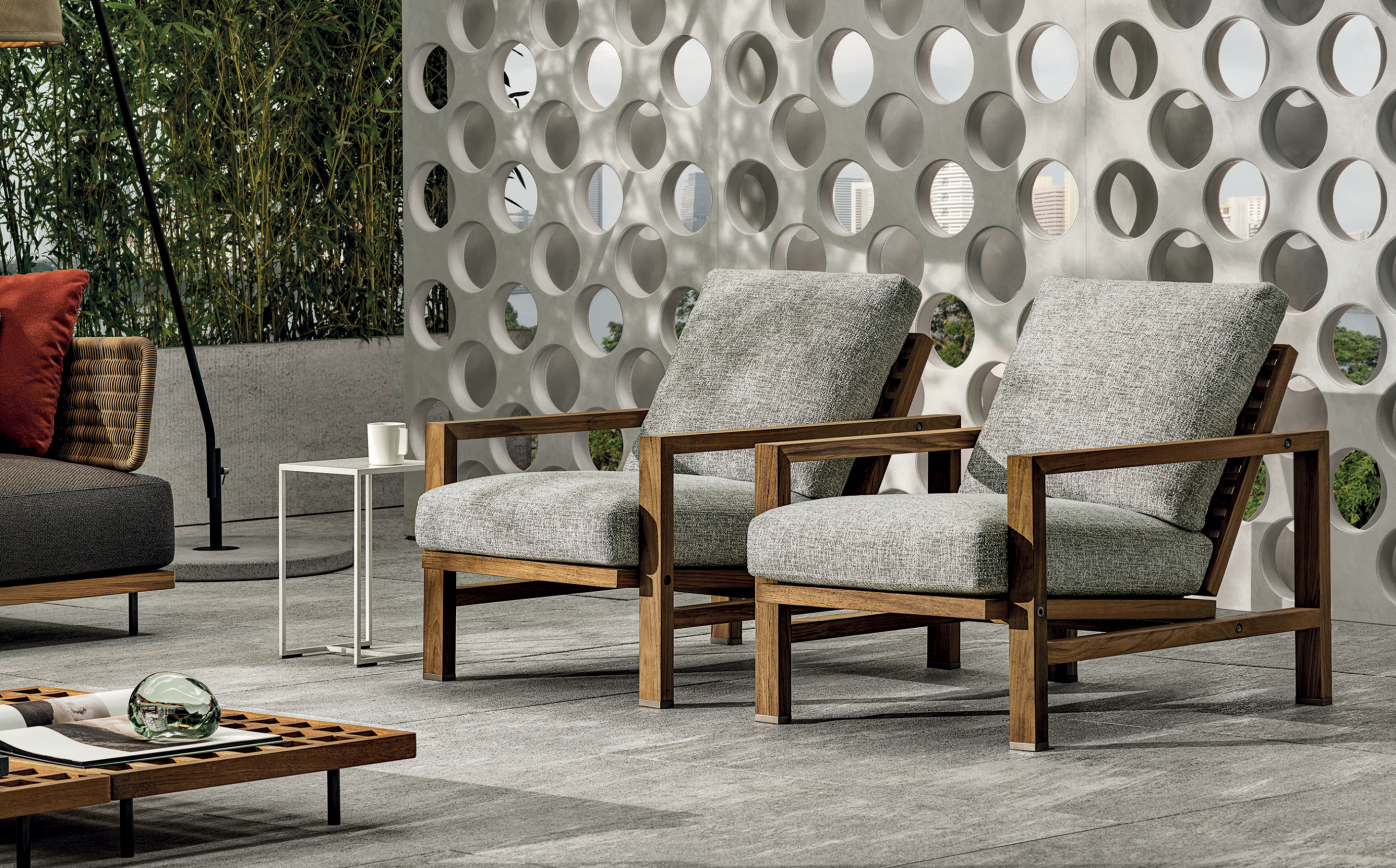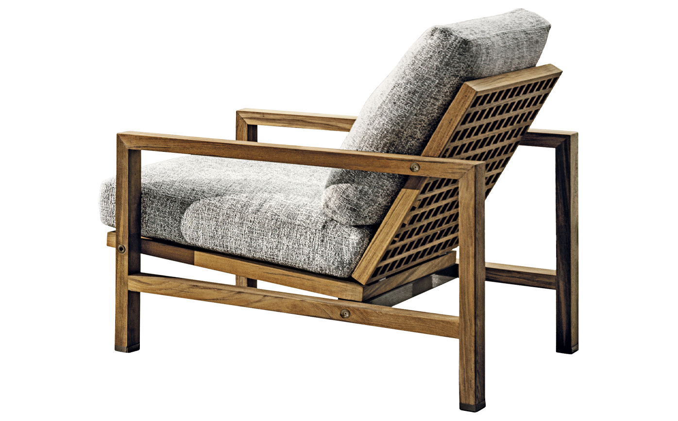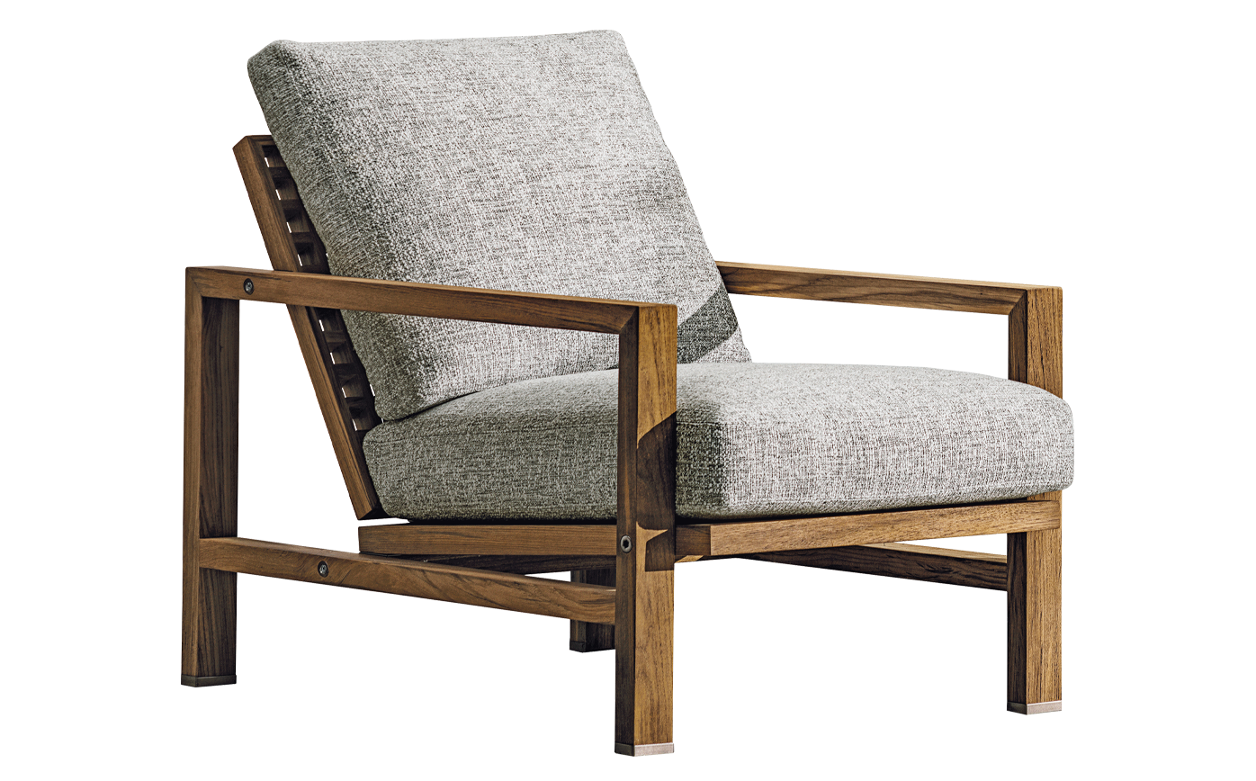 The perfect relaxation companion, this beautifully crafted armchair slips seamlessly into the various arrangements of the Quadrado system, and can be used individually or together with other seats. The Teak structure, with metal details in Light Bronze finish, have straight armrests and accommodate the padded backrest cushions and seat.
