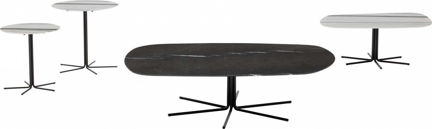 Defined by their thin thickness and their ethereal structure, the Rays tables are completed by the top available in an irregular or rounded organic shape. The radius base, consisting of a bundle of metal rods that fold and rise vertically, supports the top, in marble or wood.
