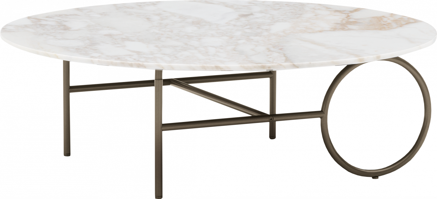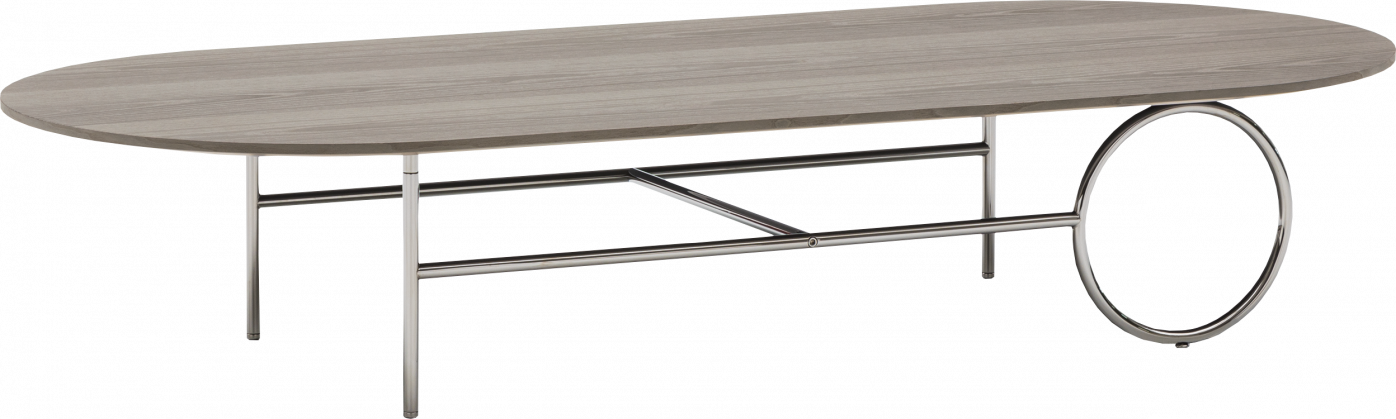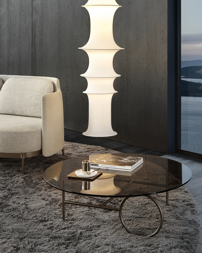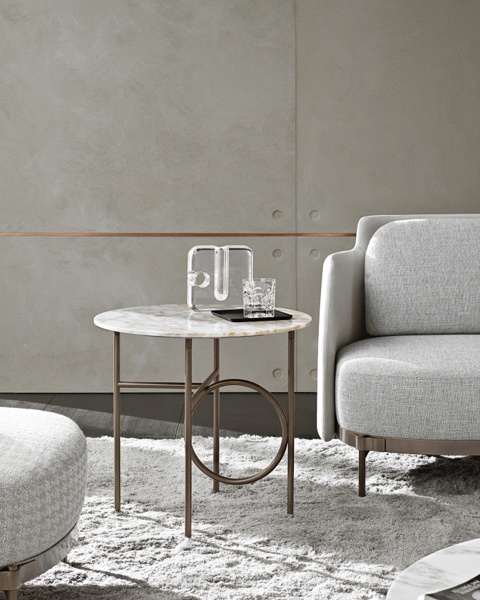 The metal frame, available in Light Bronze, Copper or Black-Nickel, comes in different heights. The Ring tables are completed by an oval or circular top, with various diameters, which are customisable in bronzed glass, Calcutta marble or Liquorice brushed ash.