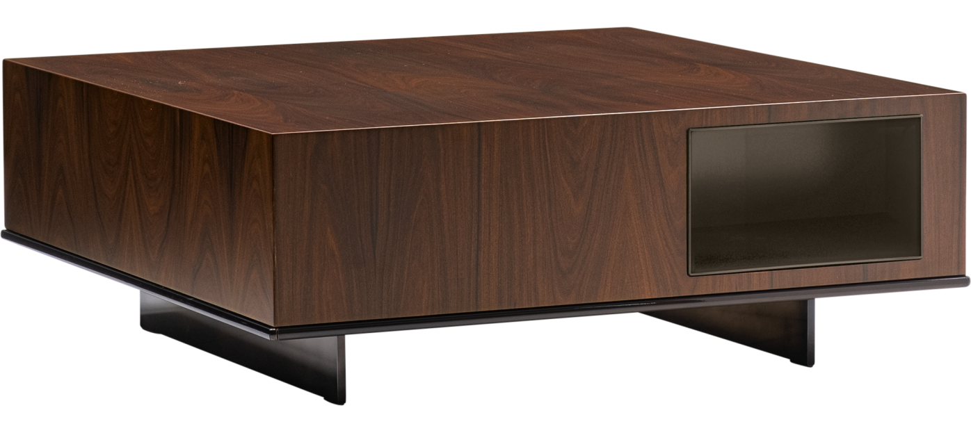 The Roger coffee tables complement the exceptionally versatile Roger modular sofa system. The range includes three coffee tables in the form of a precious box with a rigorously geometric volume. These host storage compartments featuring an aluminium lining with a Brandy-coloured varnished satin finish.