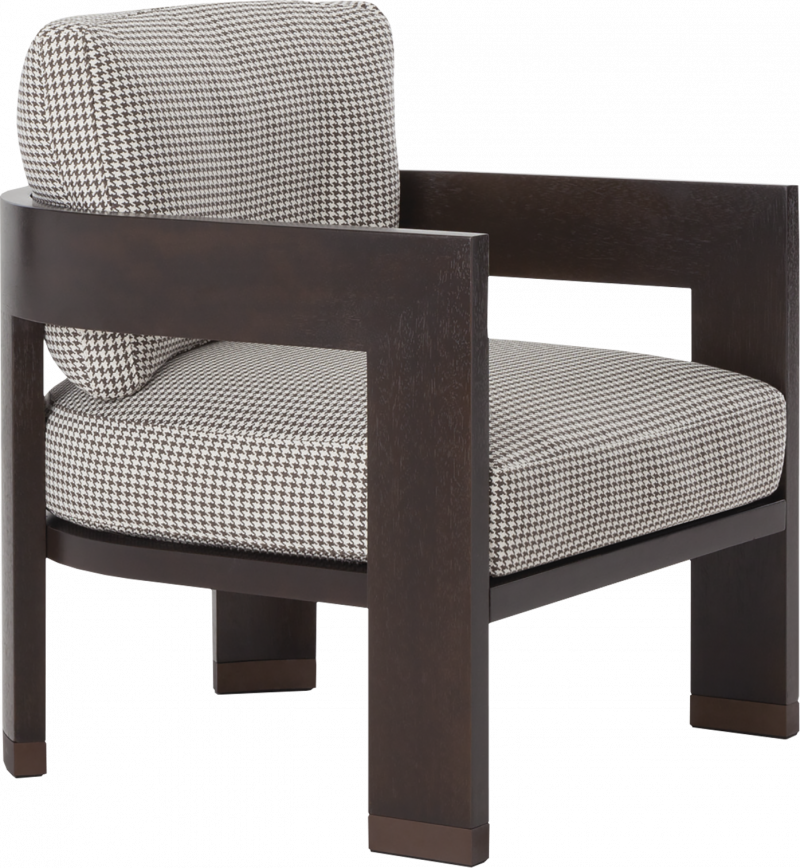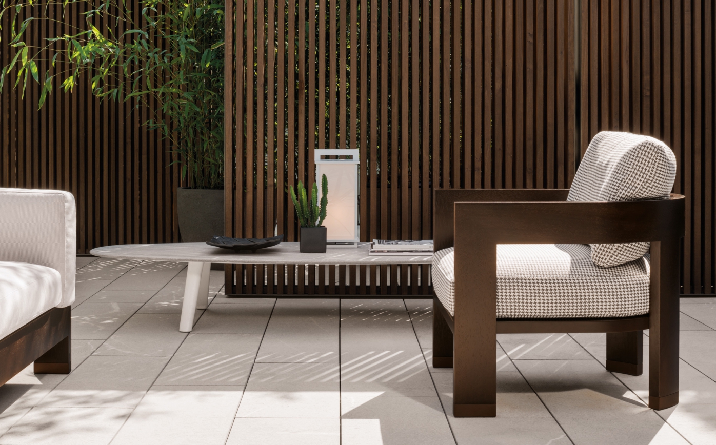 The Smithson Iroko armchair of solid natural Iroko timber frame suitable for indoor use or in a 'winter-garden' / covered balcony with seat and back cushions in variable-density polyurethane foams with synthetic fibre surround. Available upholstered in an extensive selection of fixed fabrics or leathers from the Minotti collection.