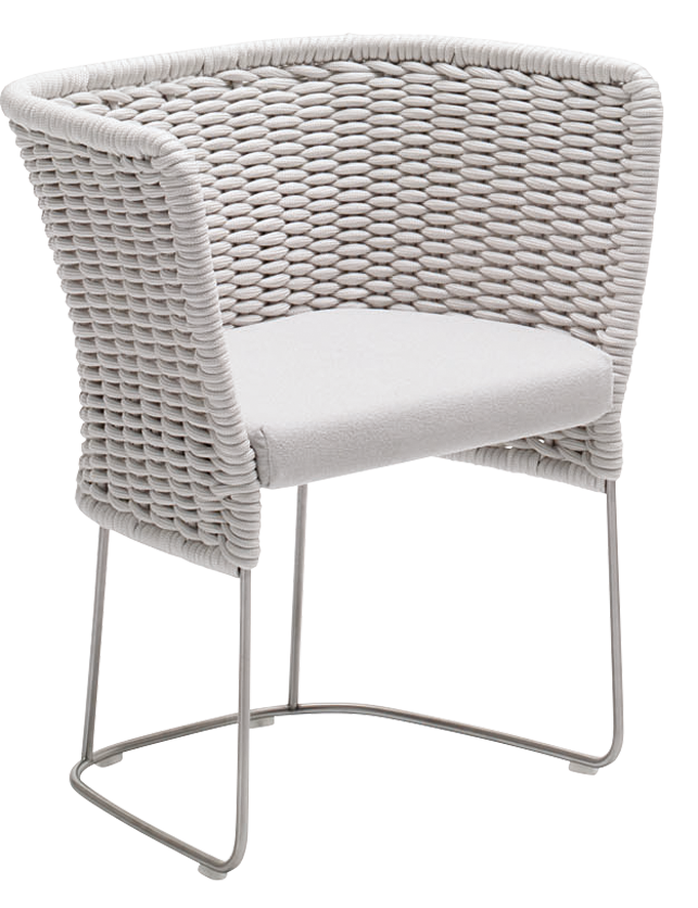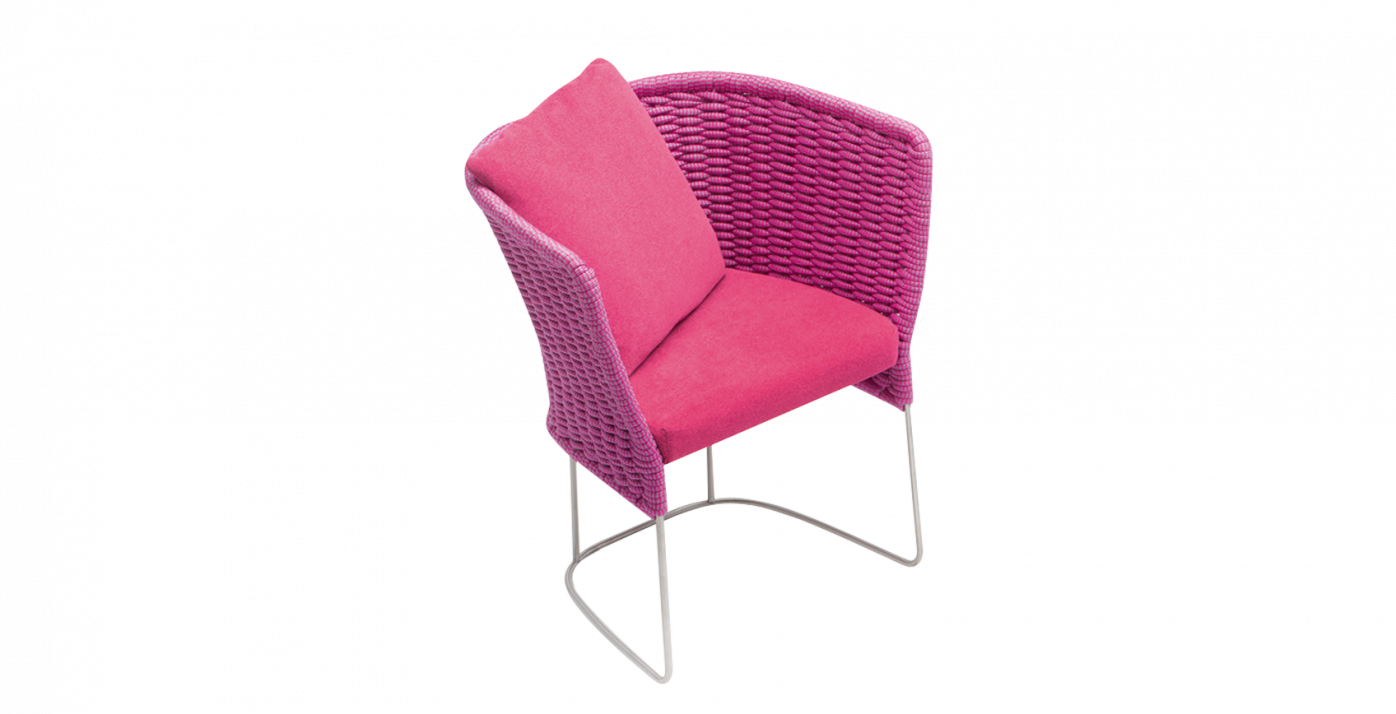 A textural weave covers the inviting and enveloping seating elements of this exclusive and refined collection. The richness of the upholstery originates from the material and the technique used to create it: a knitted, flexible tubular fabric of varying dimensions is woven directly onto the structure. The hand weaving pattern and the volume of the weave create a soft and irregular relief, which make each piece unique.