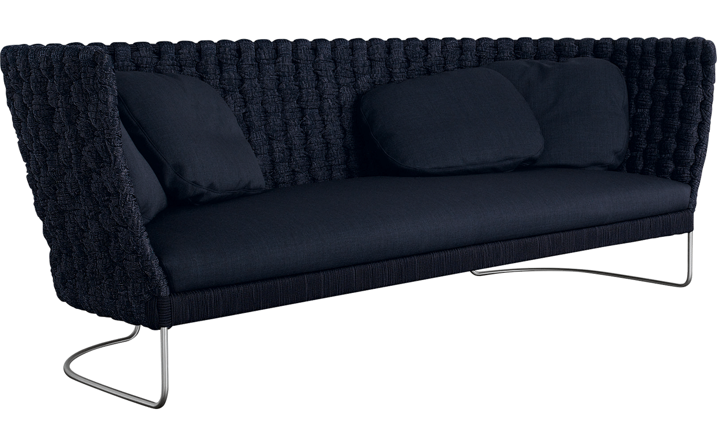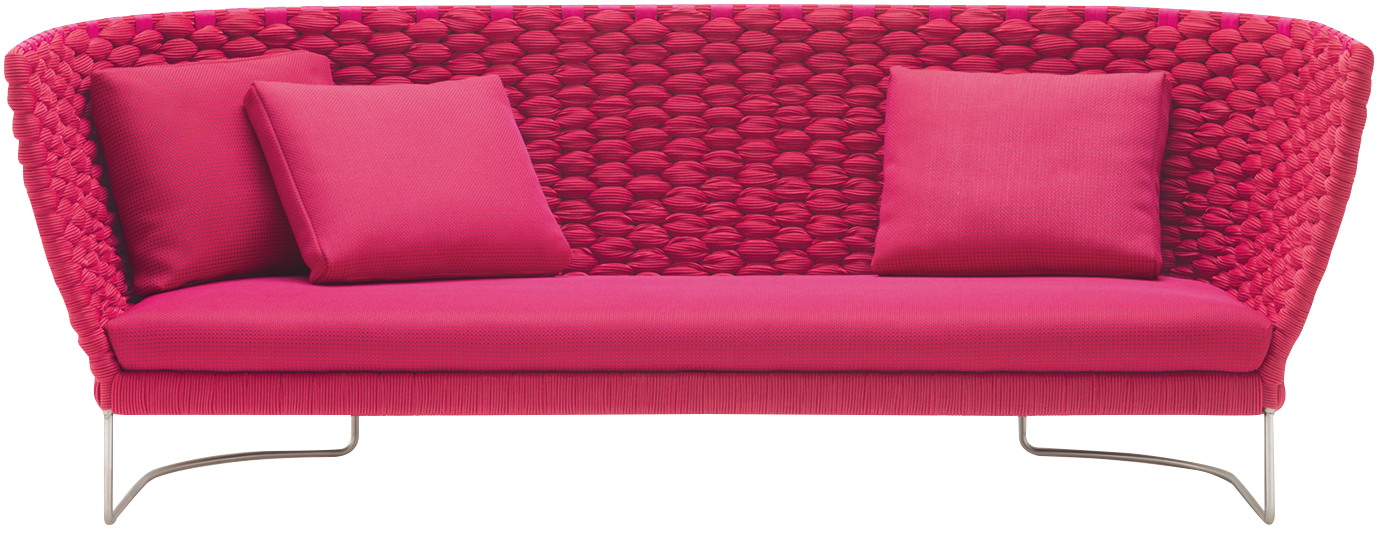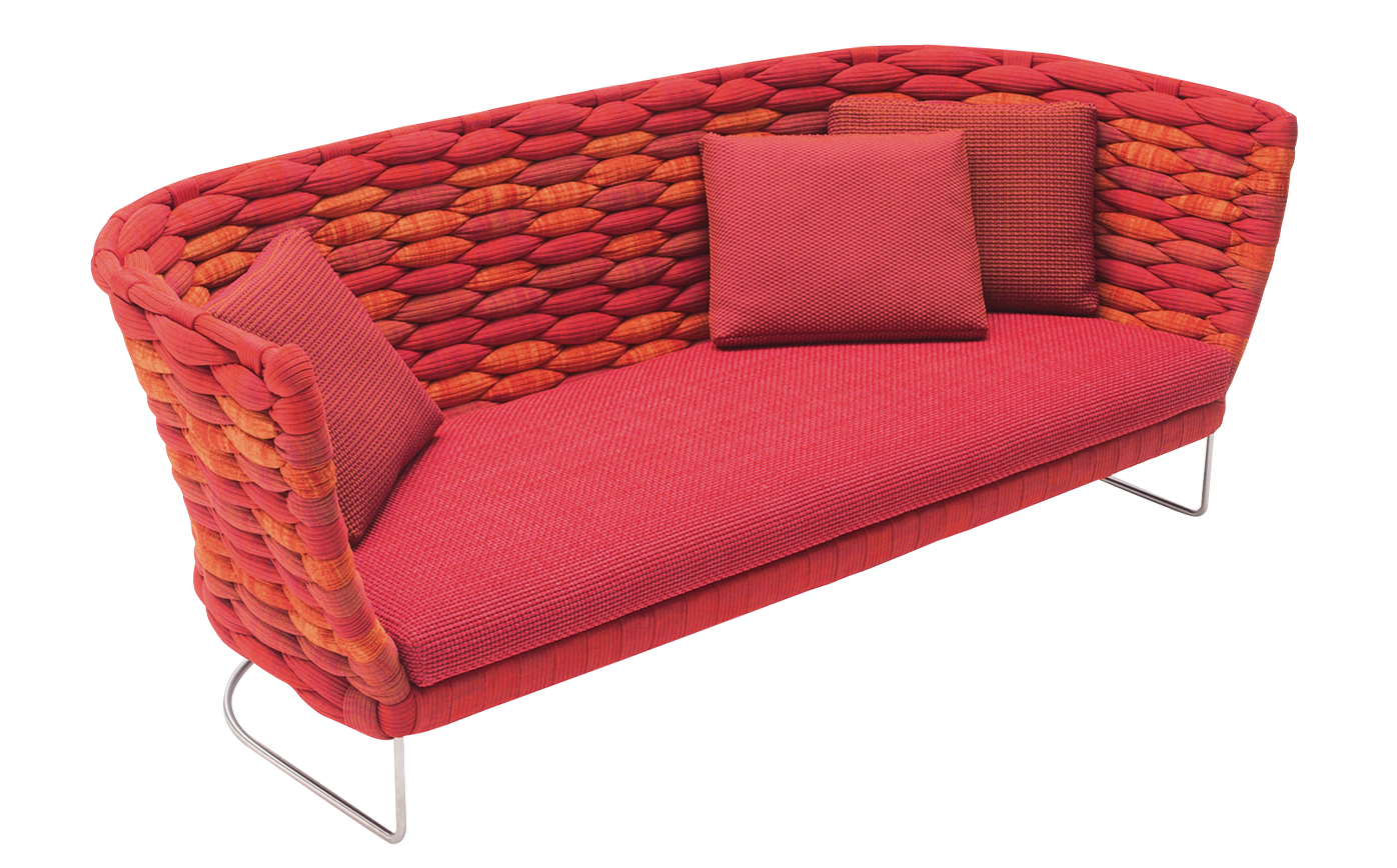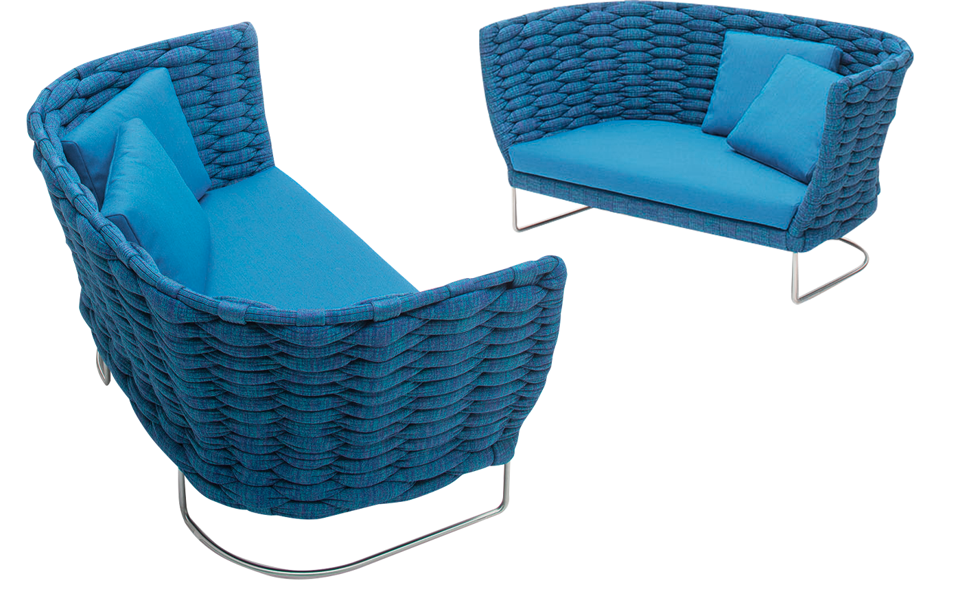A textural weave covers the inviting and enveloping seating elements of this exclusive and refined collection. The richness of the upholstery originates from the material and the technique used to create it: a knitted, flexible tubular fabric of varying dimensions is woven directly onto the structure. The hand weaving pattern and the volume of the weave create a soft and irregular relief, which make each piece unique.
