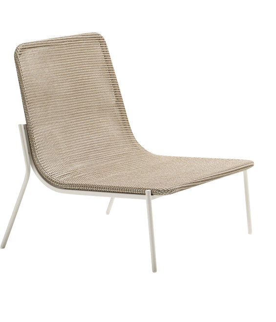 Structure in stainless steel powder varnished in avorio or grafite colours, plastic spacers. Fixed cover in Rete, Paola Lenti signature fabric, in colours suitable with the structure. A seat pad in open cell polyurethane or in the Flex version, and a loose cushion are necessary to complete the seat. Seat pad and loose cushion covers available in Luz and Rope T fabrics, suitable for outdoor. Protection Winter Set cover available.