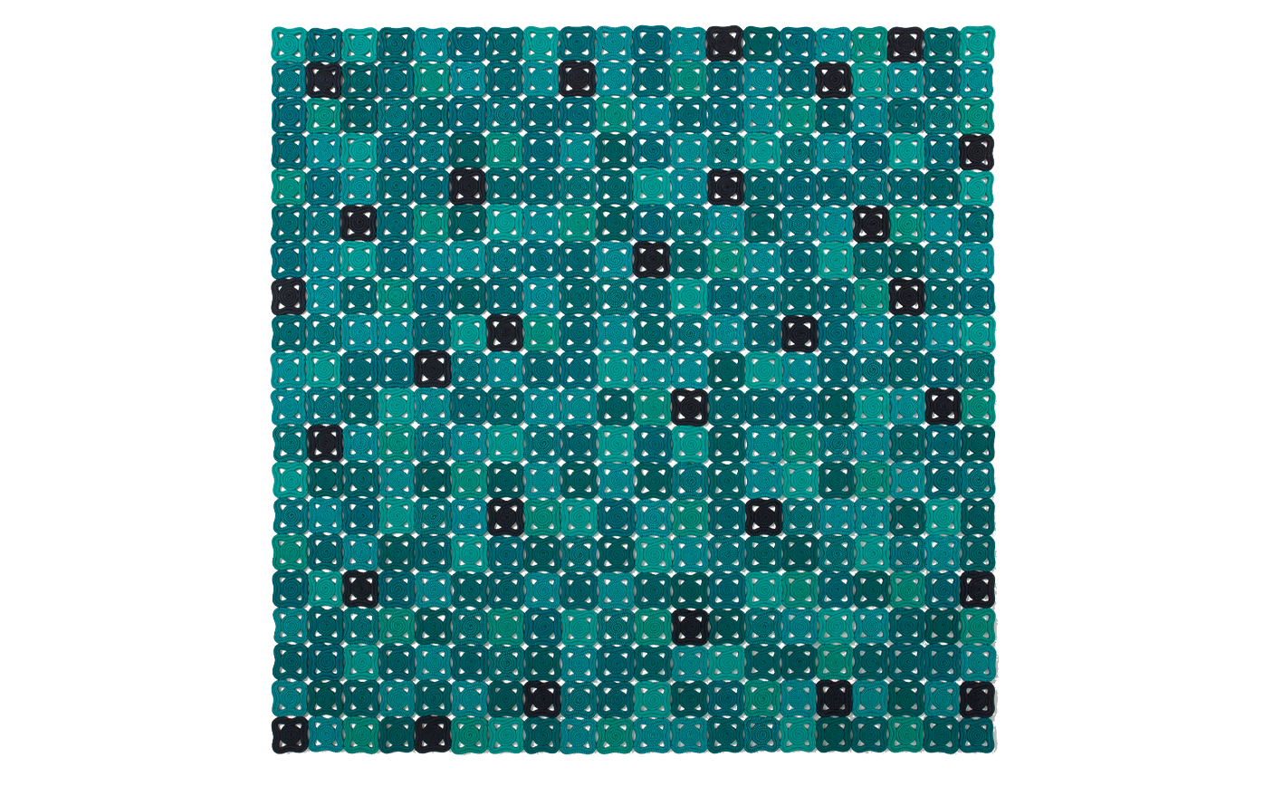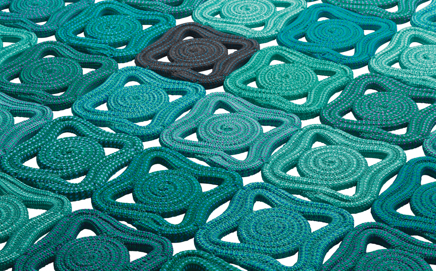 This modular rug for exterior and interior environments is created by joining elements made of one- or two-colour cords. The cord is shaped and sewn by hand to create decorating modules of about 12x12 cm. These elements are then sewn with an orthogonal placement to form the rug’s surface. The handwork and the preciousness of the designs lead the Company to advise against the use of Bisanzio in high traffic areas. Only one colour can be chosen.