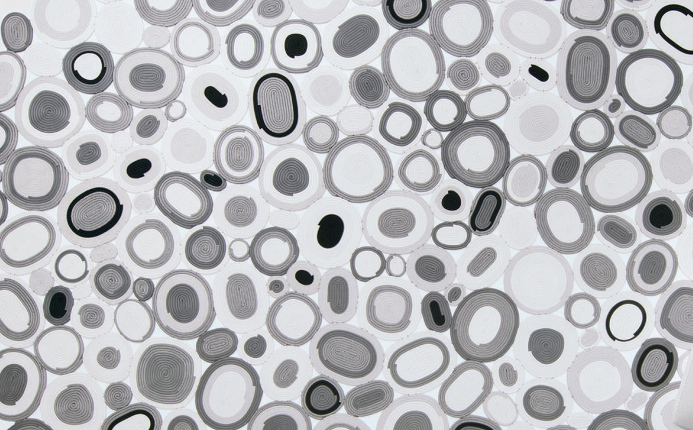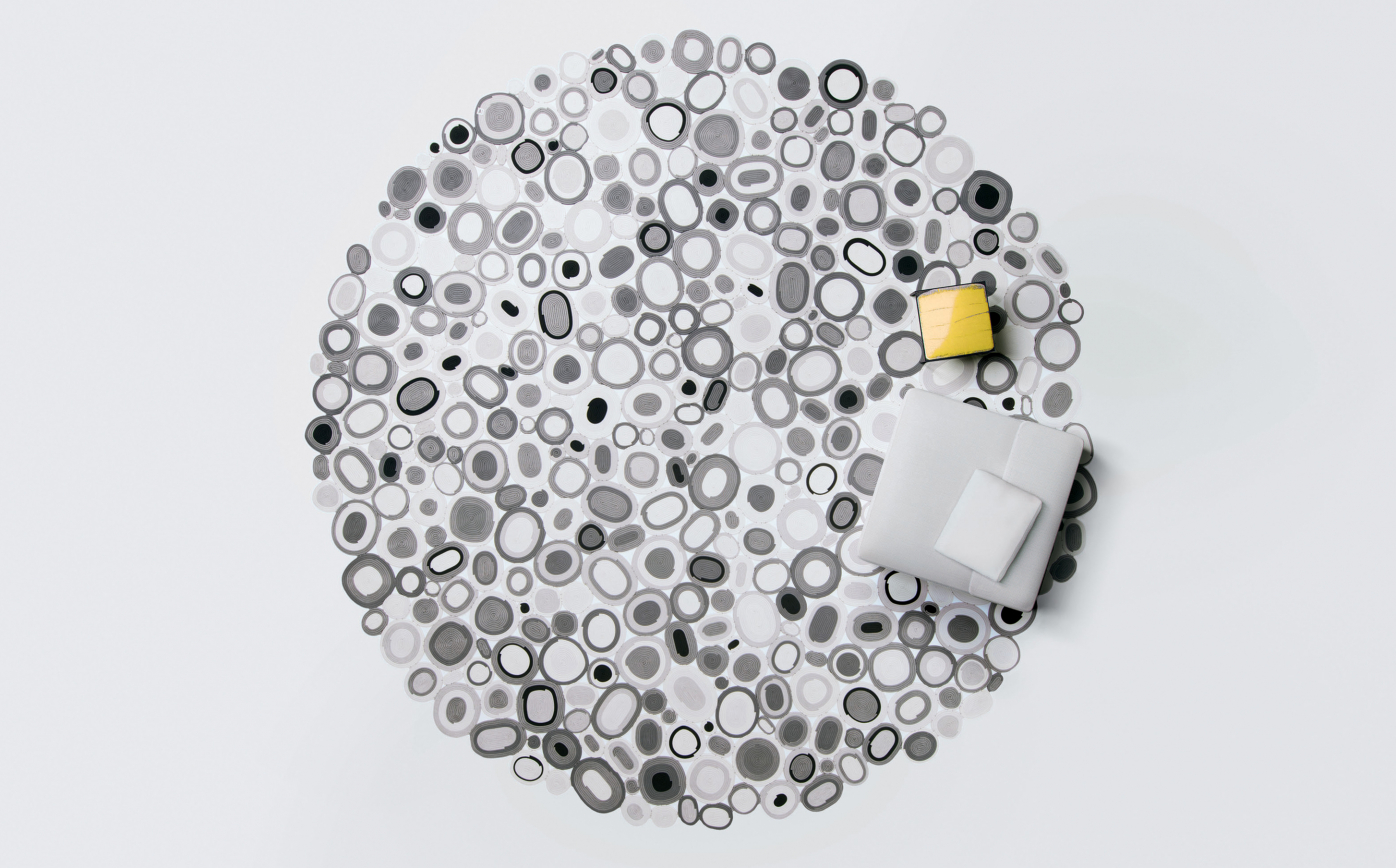 Rug for exterior and interior environments created with elements made of one- or two-colour cords. The cords are shaped and sewn by hand to form round and oval decorating modules. These modules are then joined together freely to form the rug’s surface. Up to a maximum of four colours can be selected.