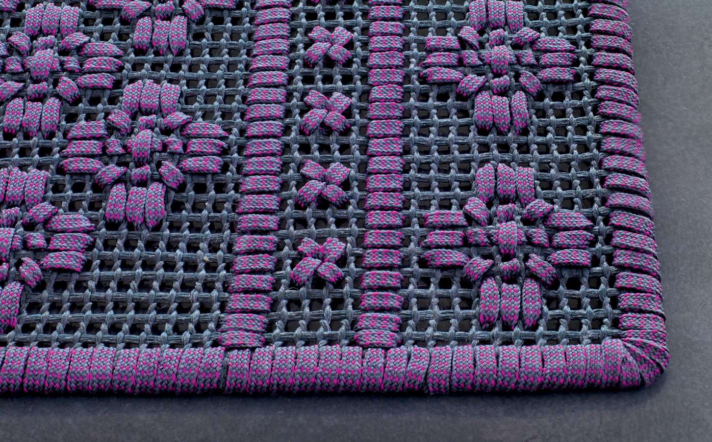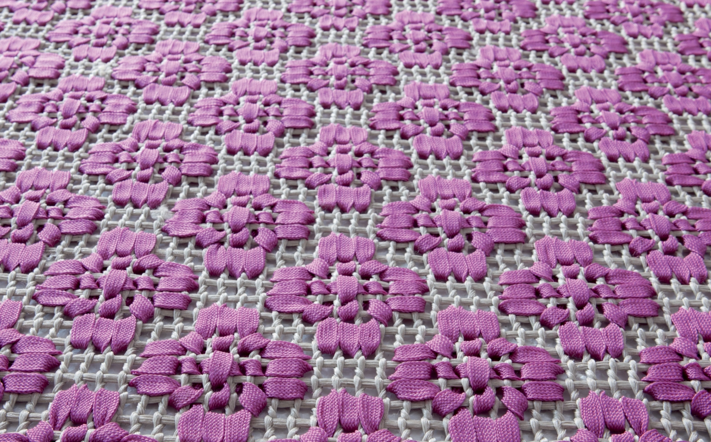 Rug for exterior and interior environment with handmade decoration. The embroidery is executed with a one- or two-colour flat braid on the backing in Kimia fabric available in sand or basalto colour. The handwork and the preciousness of the designs lead Paola Lenti to advise against the use of Giardino in high traffic areas. Only one colour can be chosen.