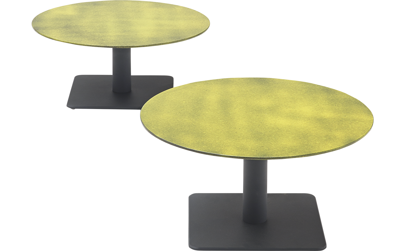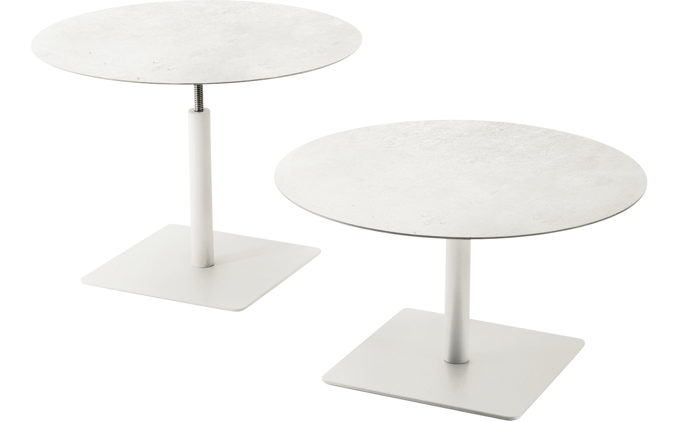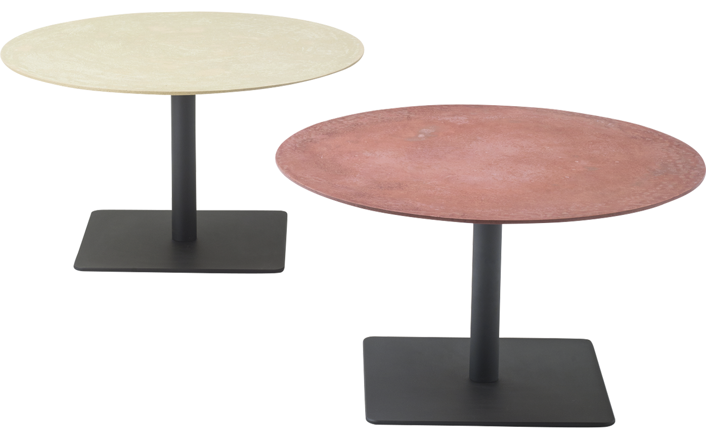 Side tables with round top. The series Giro also includes high tables available in the same finishes.