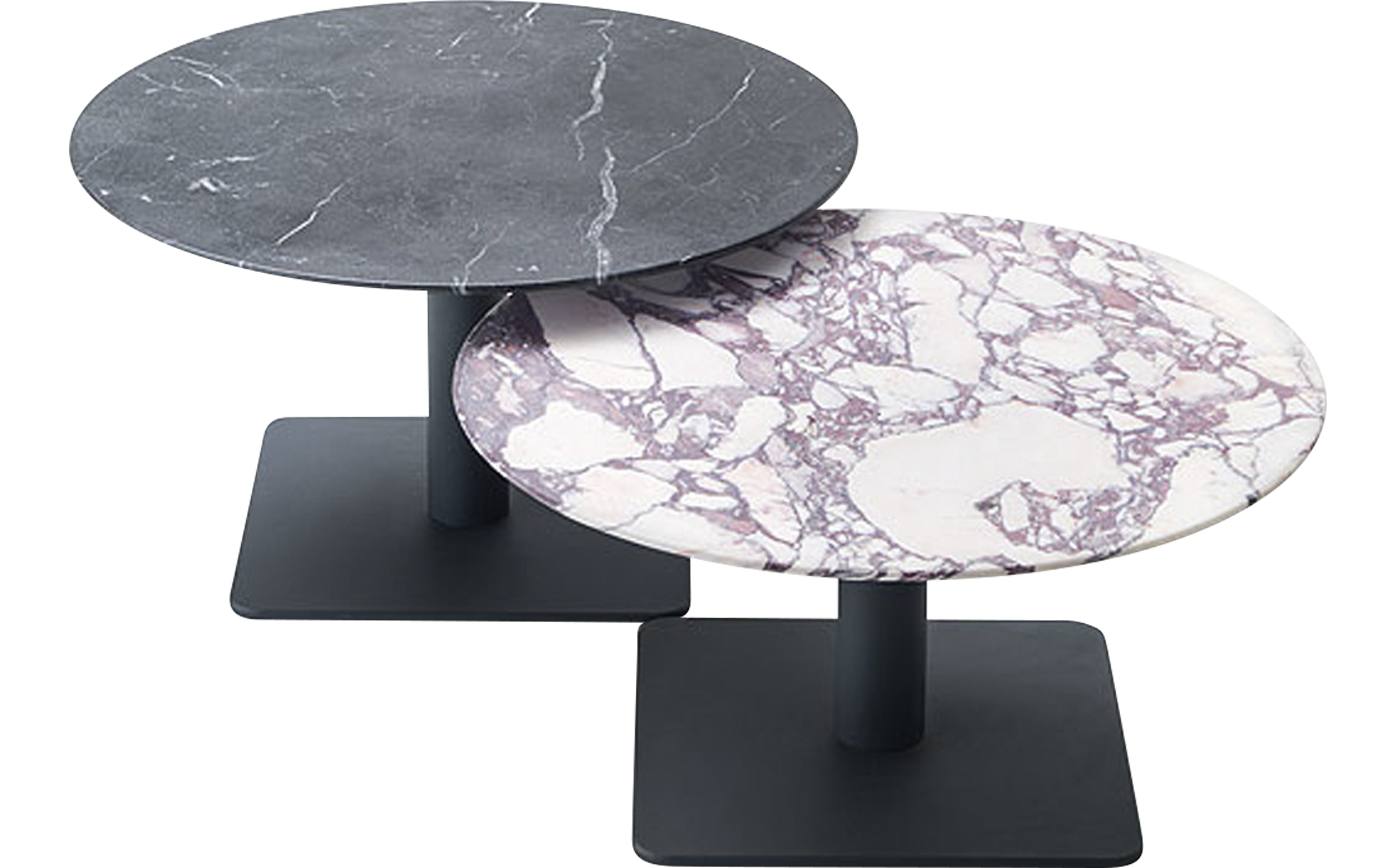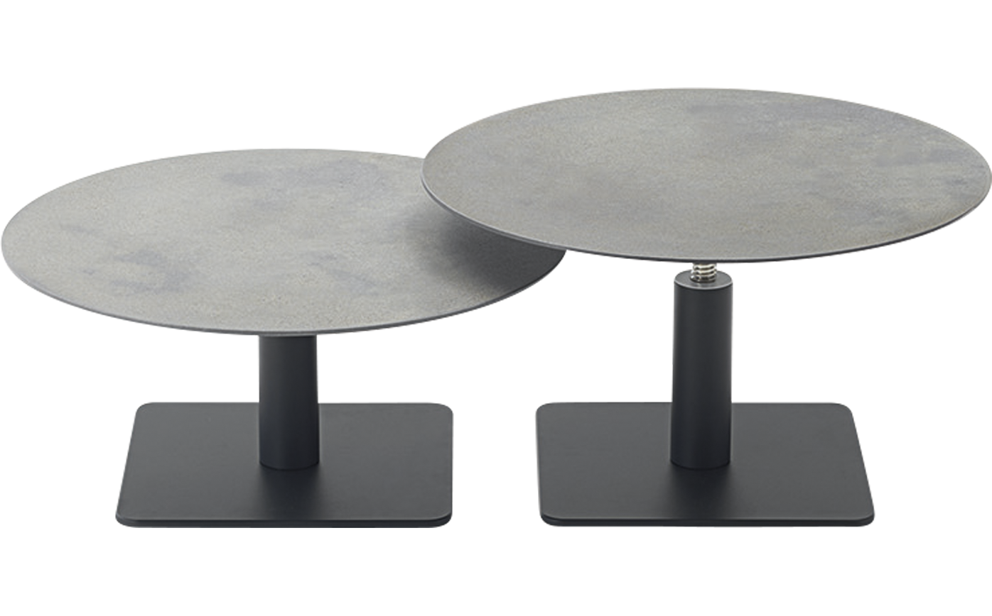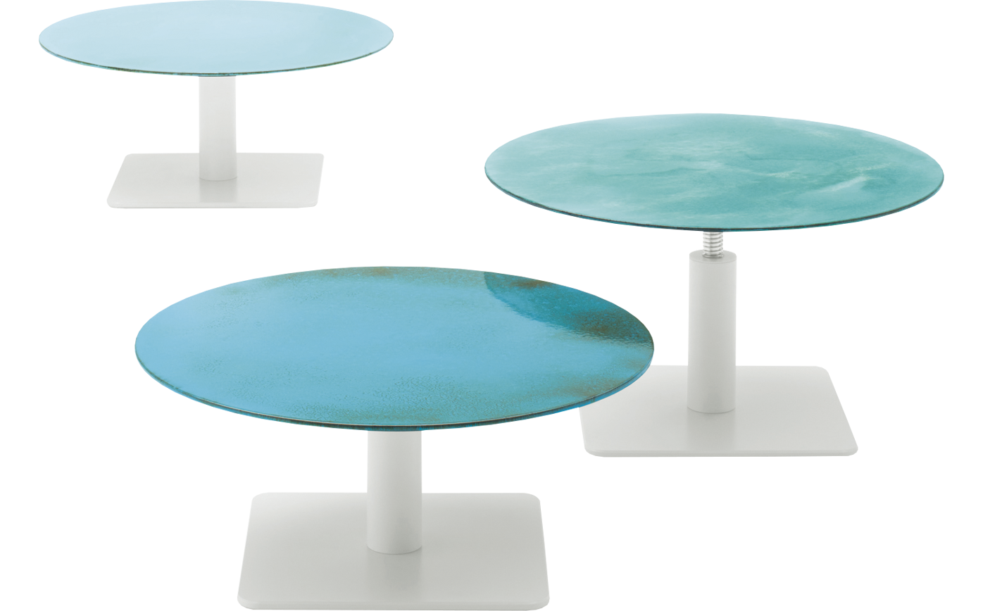 Side tables with round top. The series Giro also includes high tables available in the same finishes.