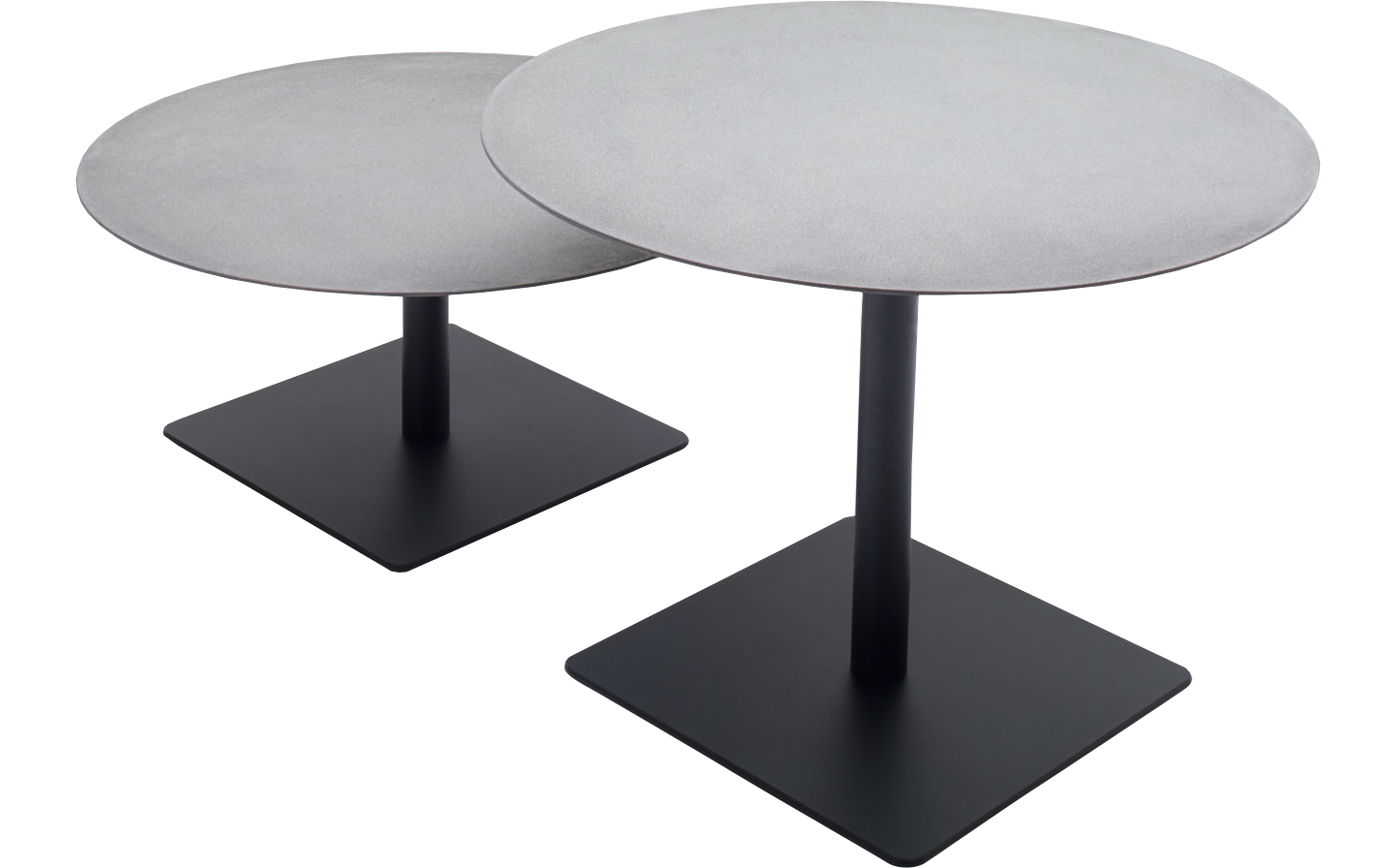 Table and side tables for indoor and outdoor. The thin top, made of lightened concrete, without resins is 100% recyclable, rotates on itself through use of a worm gear that allows the height of the table to adjust to the desired level.