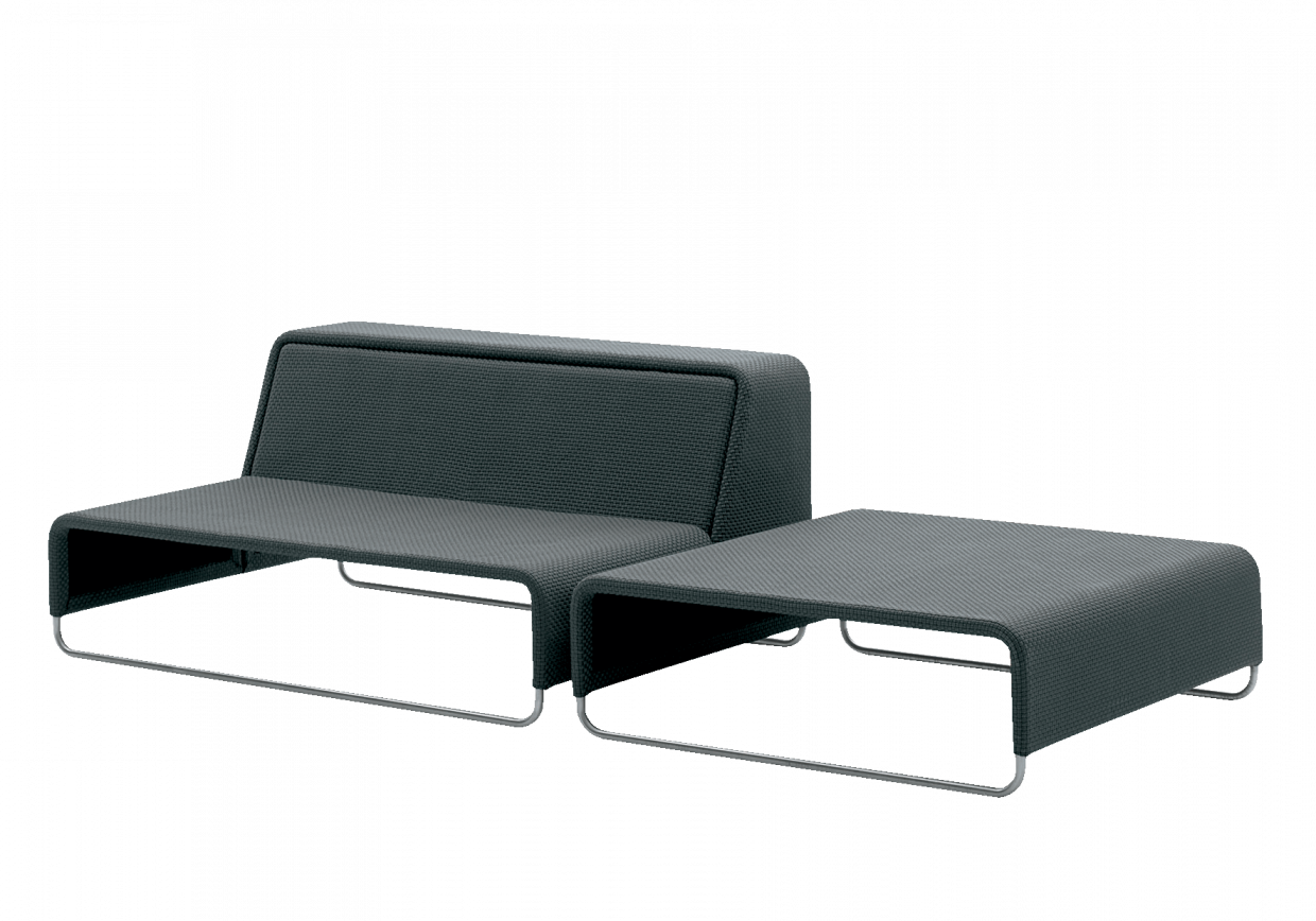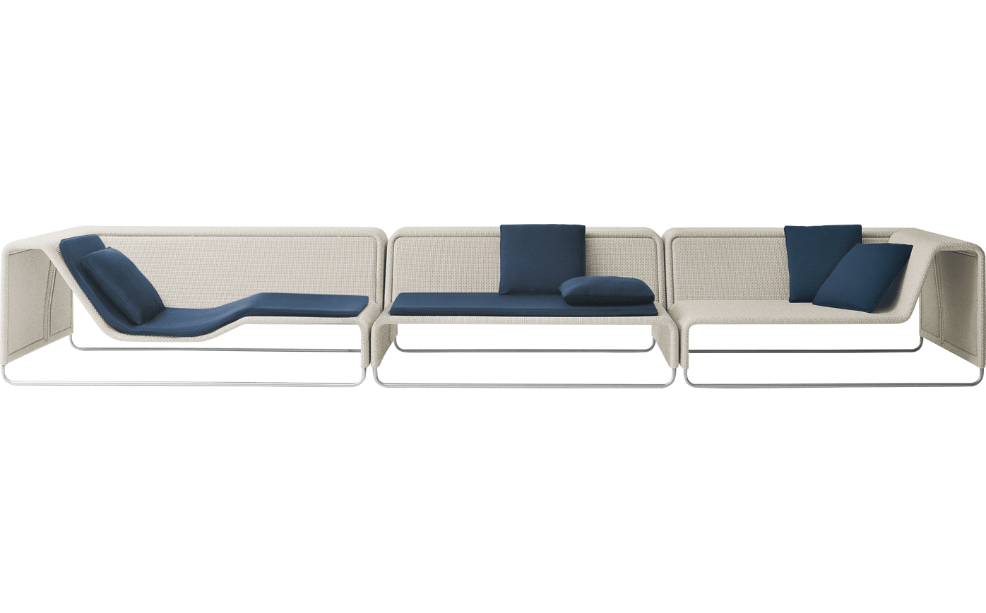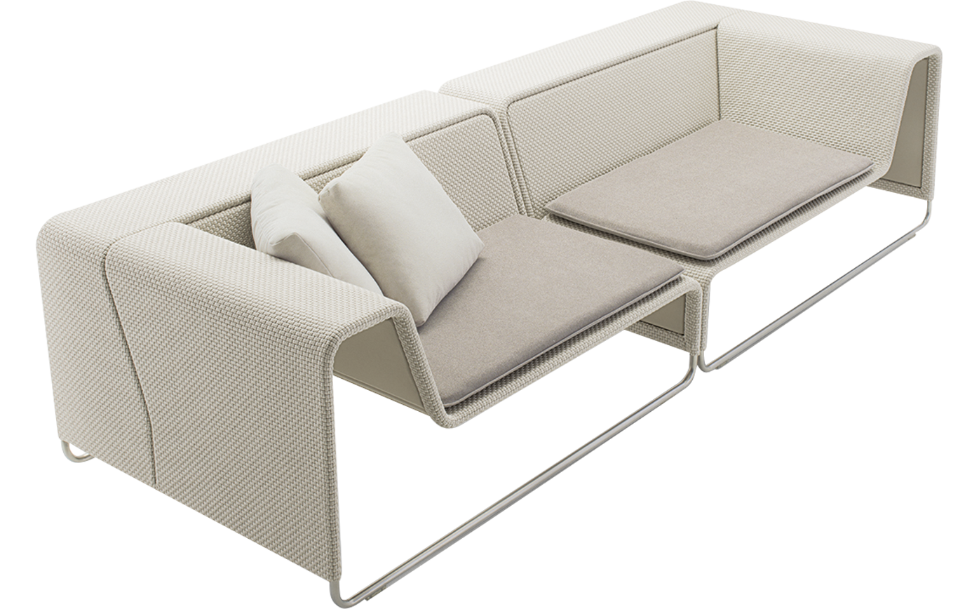 Struttura in acciaio trattato con cataforesi e verniciato poliestere, base in acciaio inox con puntali in materiale plastico. La struttura ha un rivestimento fisso nel tessuto per esterno Rope. Il materassino è disponibile in poliuretano a celle aperte e tessuto spaziato o nella versione Flex. Il rivestimento sfoderabile del materassino e dei cuscini è realizzato nei tessuti per esterno Luz e Rope T. E' necessario l’utilizzo di almeno due cuscini di appoggio per ogni posto a sedere. Disponibile un winter set di protezione.