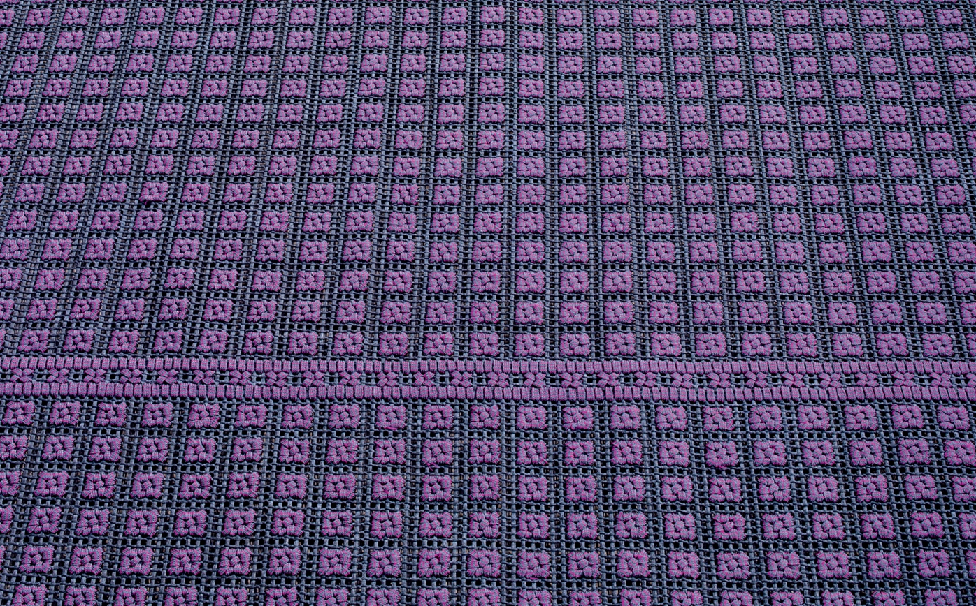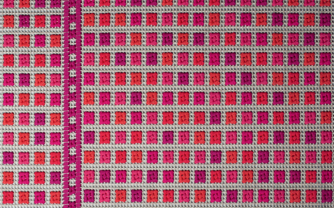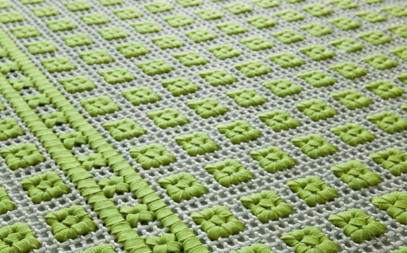 Rug for exterior and interior environment with handmade decoration. The embroidery is executed with a one- or two-colour flat braid on the backing in Kimia fabric available in sand or basalto colour. The handwork and the preciousness of the designs lead Paola Lenti to advise against the use of Orto in high traffic areas. Only one colour can be chosen.