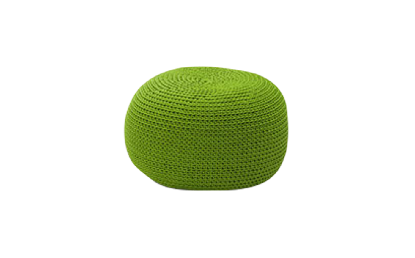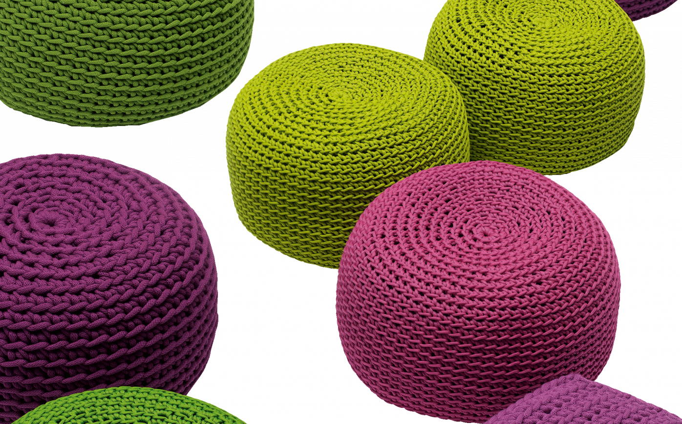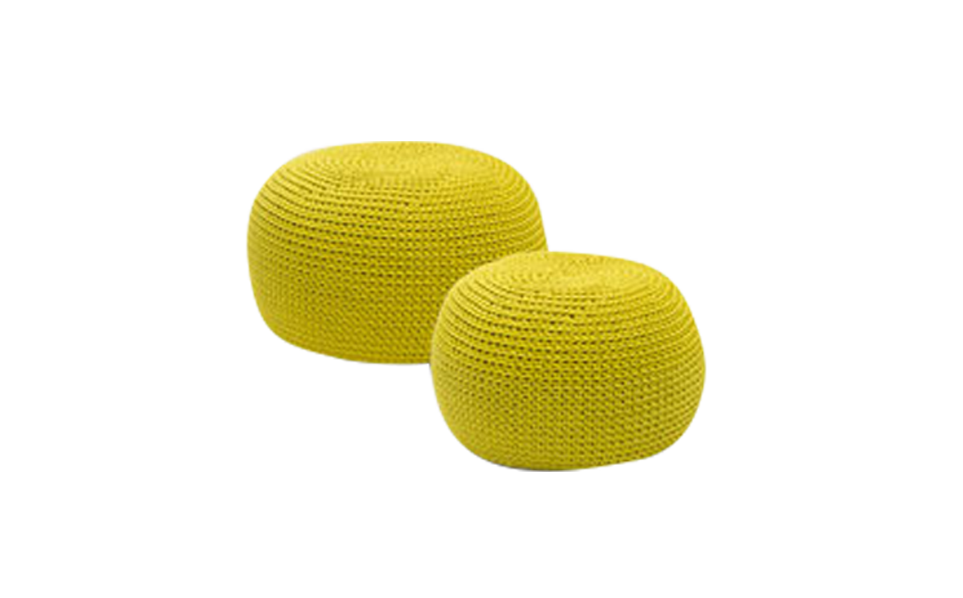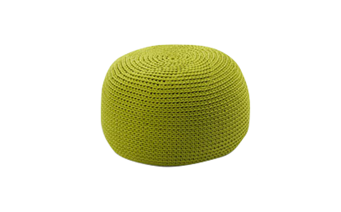 The internal padding in polystyrene spheres is encased in a polyester spaced fabric. When the pouf is used indoor, the removable cover is made with a wool cord; if it is used outdoor, the cord is in Rope yarn. The upholstery cover is hand crocheted in both versions.
