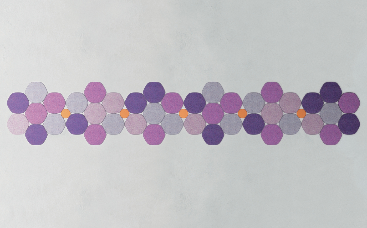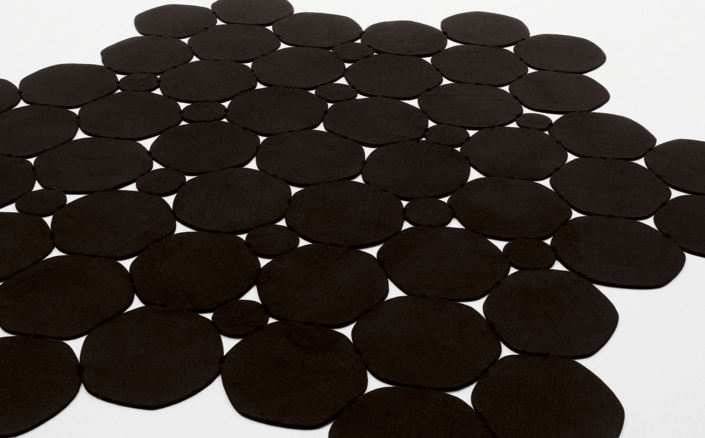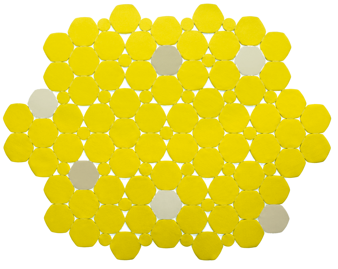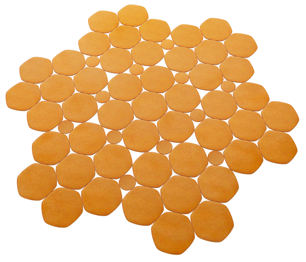 The Prisma rug is created with hexagonal, irregular forms of about cm 30x30 consisting of two layers of felt in the same colour bordered with Punto Pettine with a thread in the same tonality. These elements are then joined together with Punto Rete. To create Prisma rug, it is possible to choose only one colour.
