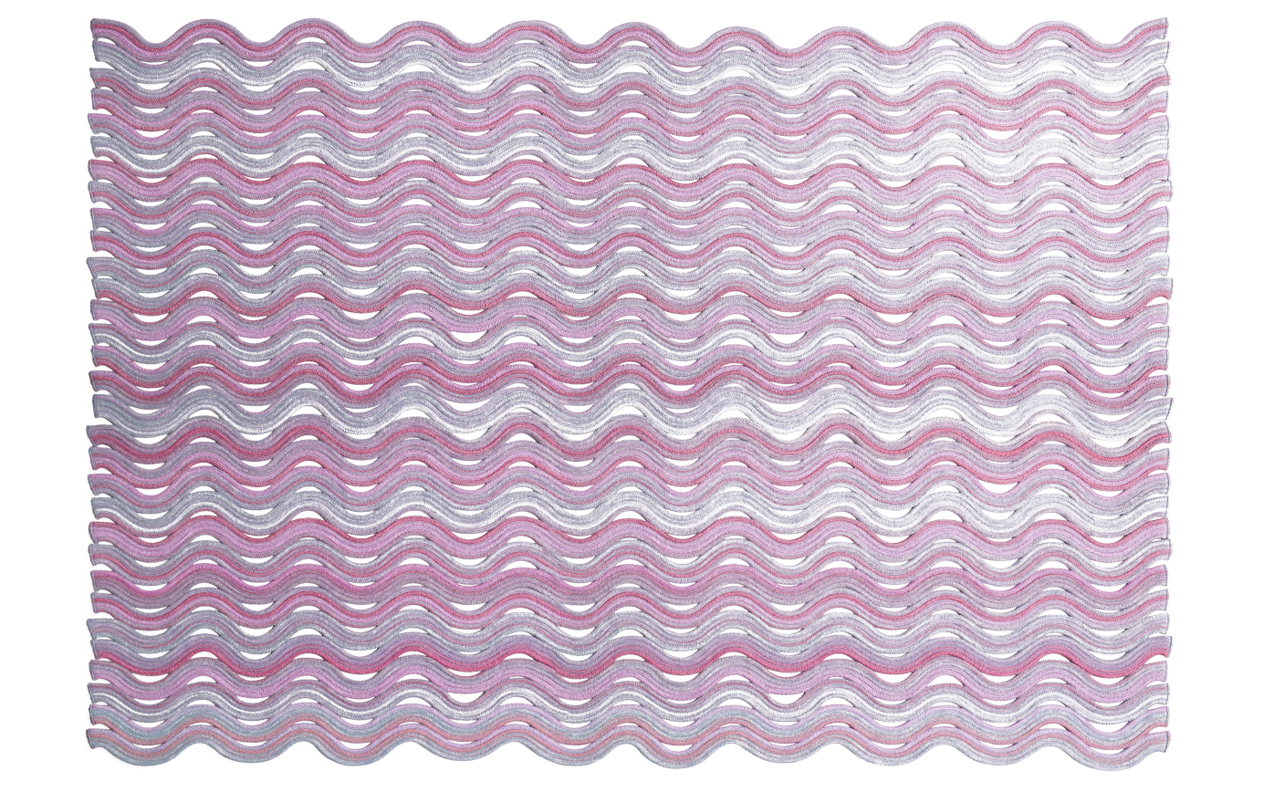 This modular rug is produced by joining lengthwise a variable number of wave-shaped stripes. Each stripe is made of wool cords in different mélange colours sewn together with Punto Zigzag. The number of stripes varies according to the dimension of the rug. The border features the Punto Pettine. Materials and production techniques lead Paola Lenti to advise against the use of Rio in high traffic areas.