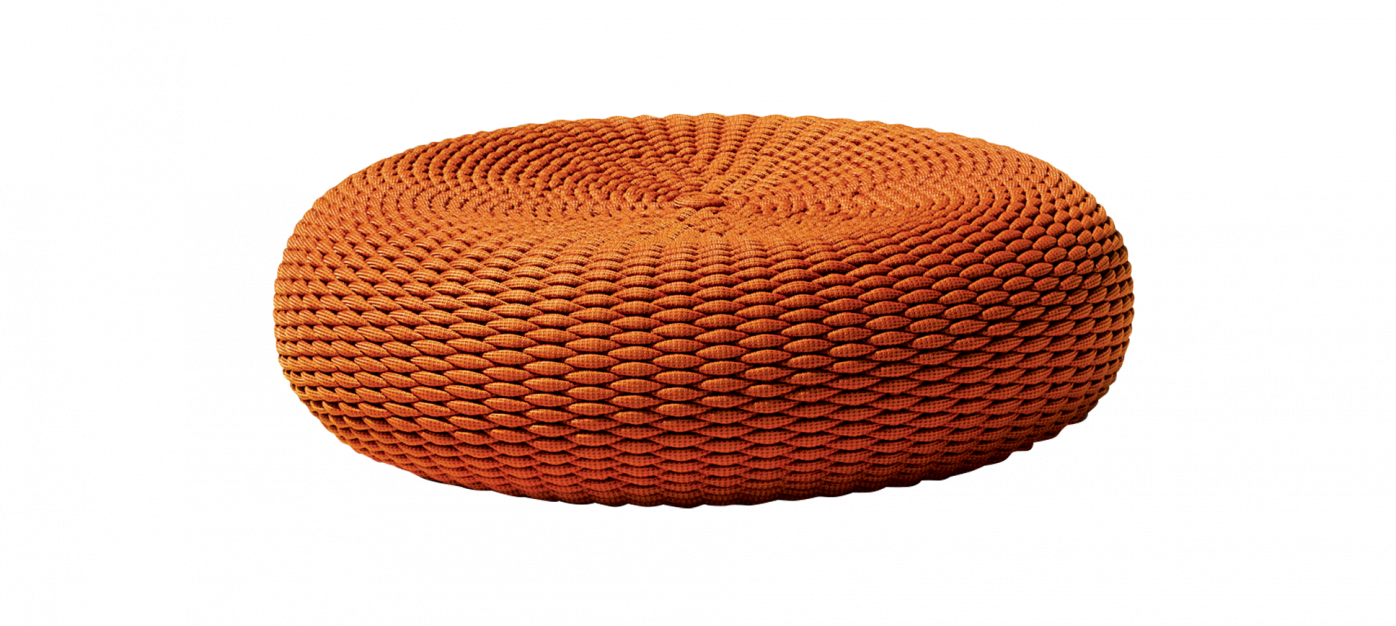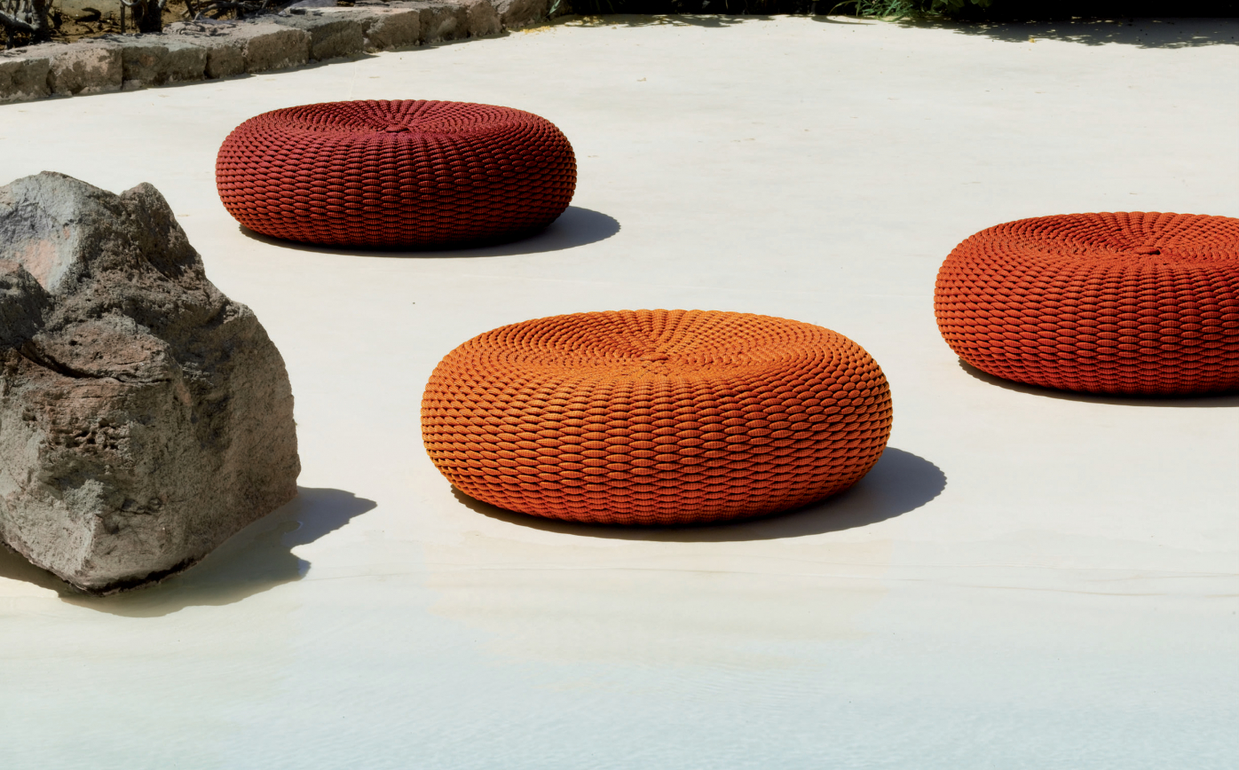 Ottoman for indoors and outdoors. Shell upholstery is created by hand weaving Rope 04 directly onto the piece. Structure in cold injected waterproof and stress resistant polyurethane foam.