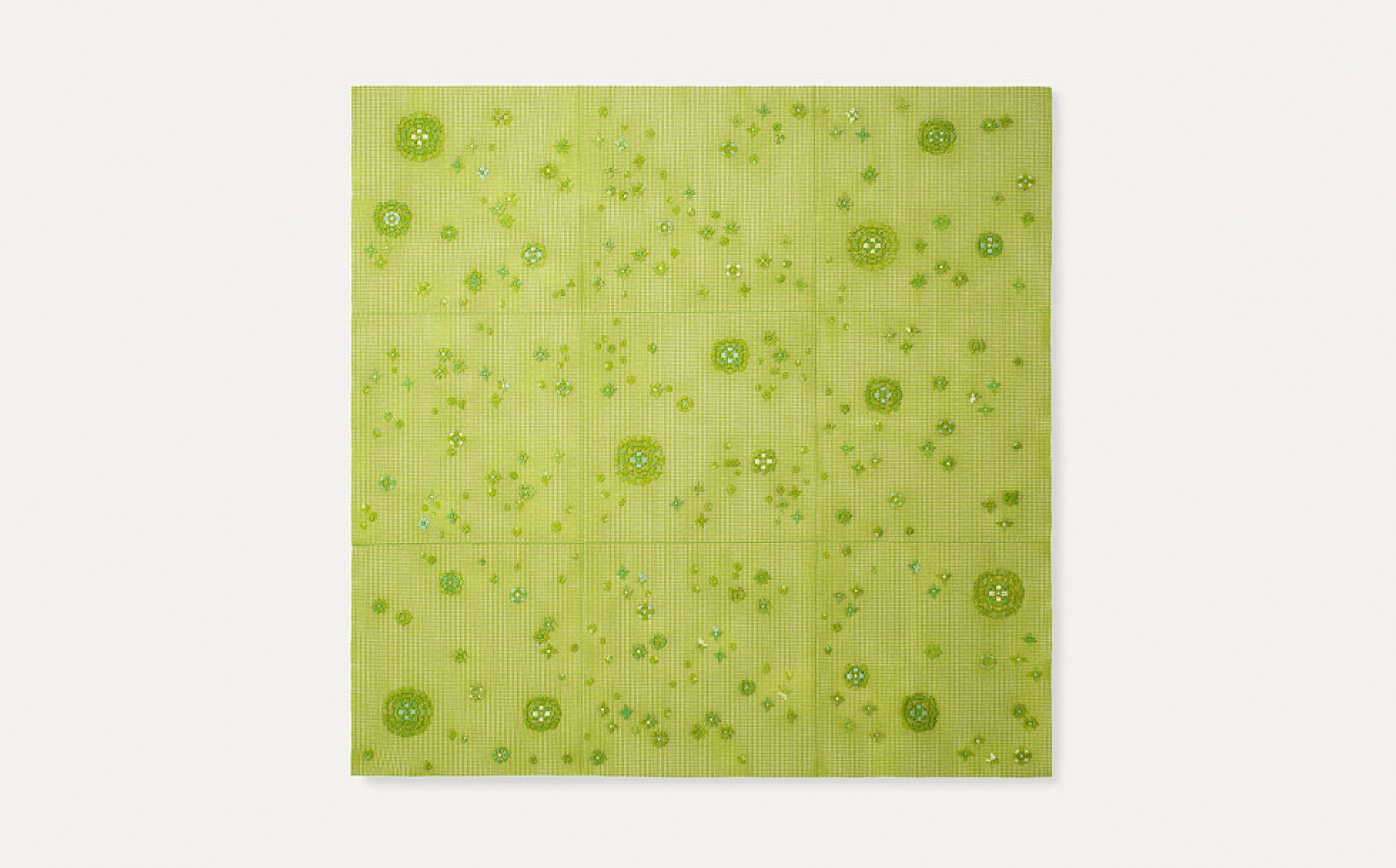 Modular rug for exterior and interior environments embroidered by hand. The floral pattern is executed with one- or two-colour flat braids in Rope yarn on elements in Kimia fabric, which form the backing of the rug. Once embroidered, the modules are sewn together with Punto Zigzag to form the surface of the rug. The number of elements varies according to the dimension of the rug. The handwork and the preciousness of the designs lead Paola Lenti to advise against the use of Spring in high traffic areas. Only one colour for the backing and up to a maximum of four colours for the embroidery can be chosen.