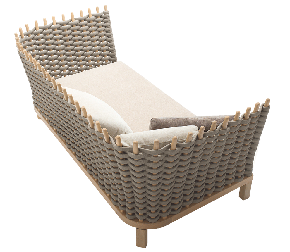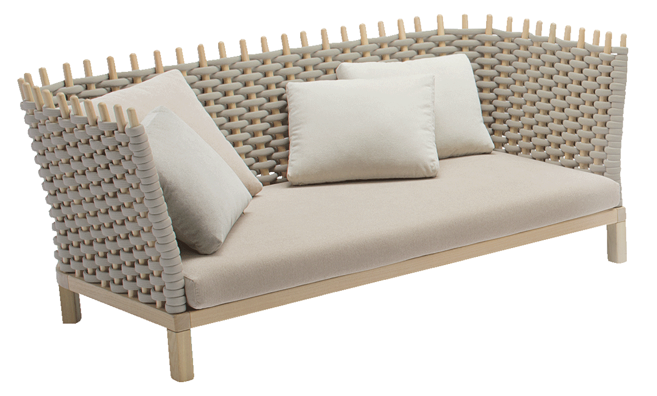 This seating collection, composed of 2 and 3 seat sofas, armchair and lawn-swing, is made entirely with eco-friendly materials. The metal structure is made of stainless steel AISI 316, the visible components in Iroko wood (certified FSC). The upholstery is made with a new thick and flexible hand weave, which makes the back soft and comfortable. It is made of non-toxic, waterproof and fire resistant silicone, covered with Paola Lenti’s signature Rope, a recyclable polyolefin based yarn.