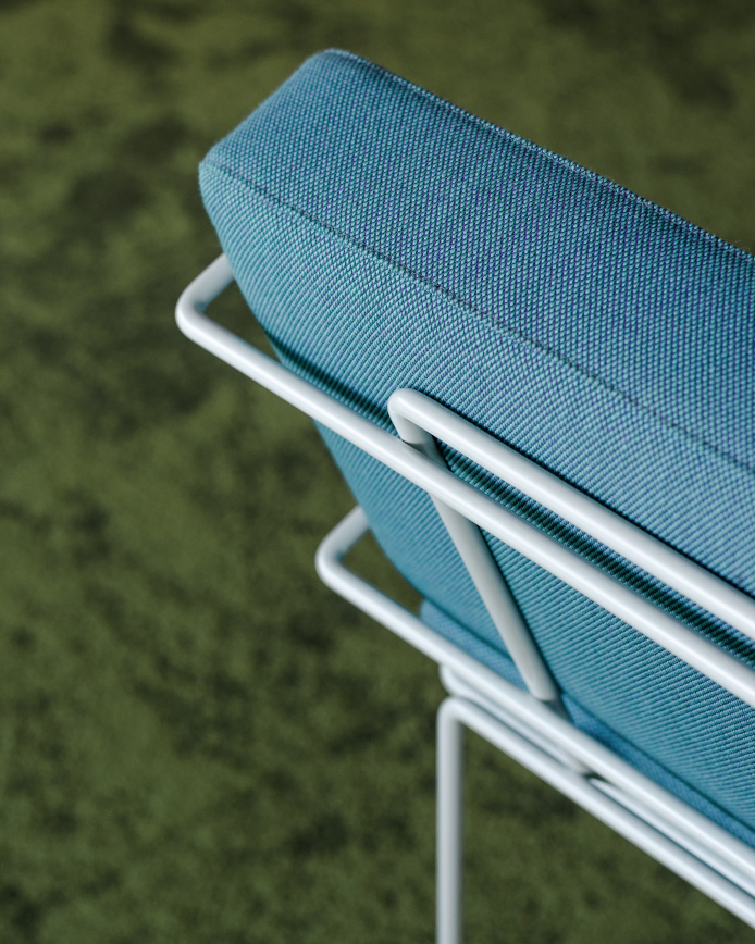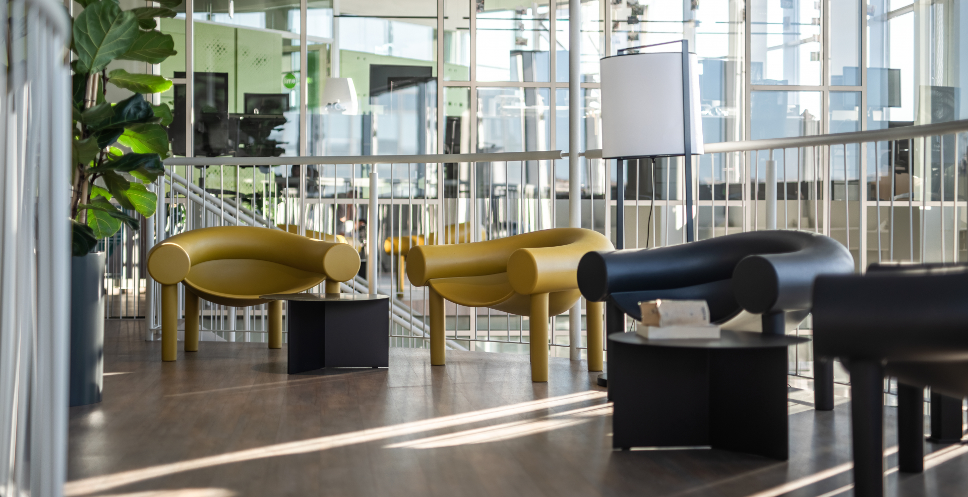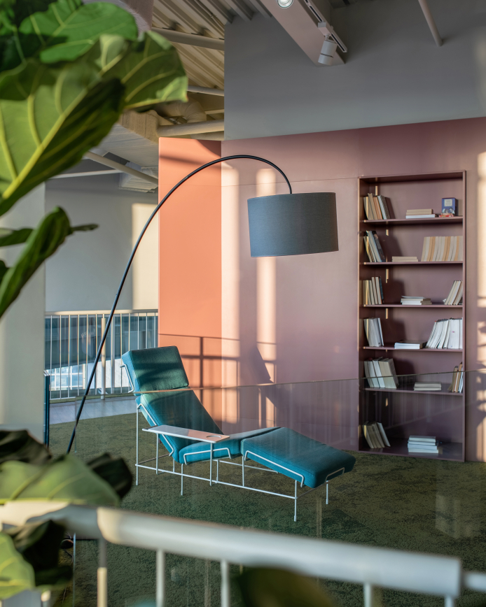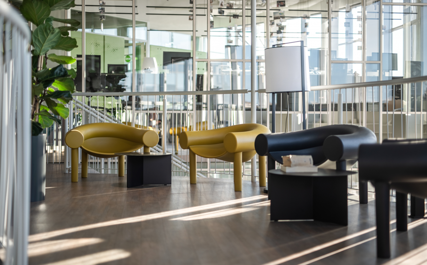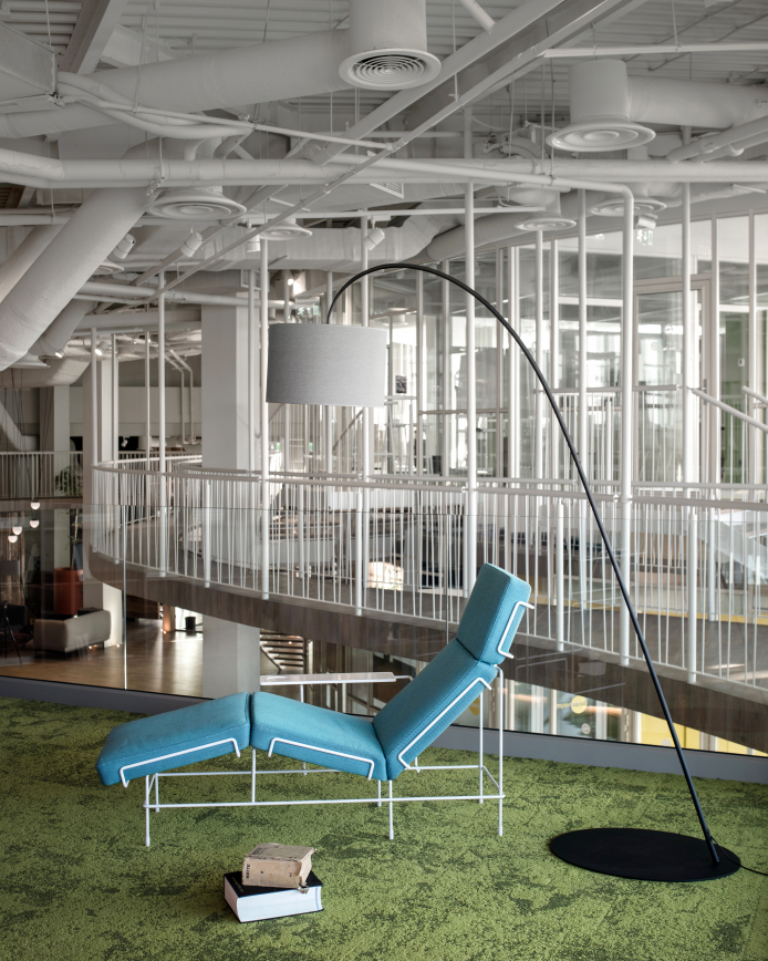 The design team are the incomparable balbek bureau well known for their large scale work with corporate and commercial spaces. They incorporated eco-friendly materials with a vibrant colour scheme and have created a sophisticated yet relaxed feel. Stand our Magis products seen here are the Spun chair in the central lobby, Sam Son chairs on the breakout balcony and the Traffic Chaise in sky blue – nice place to catch some shut eye.
