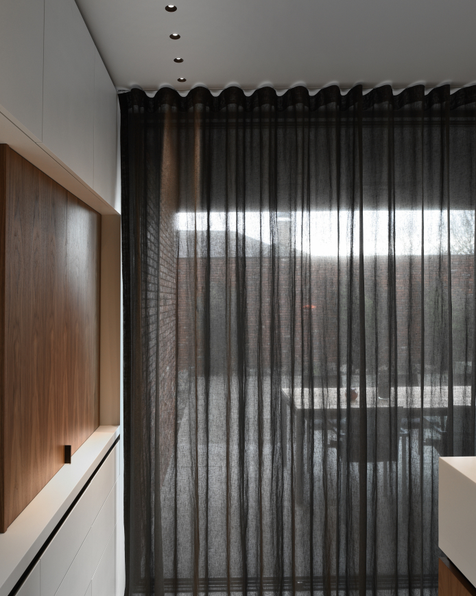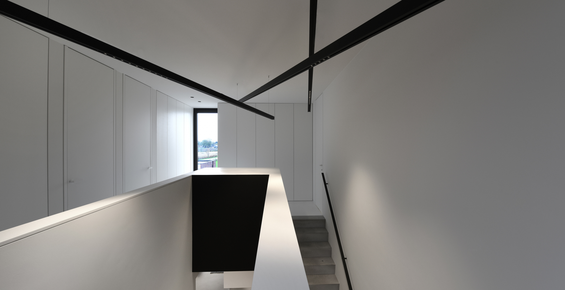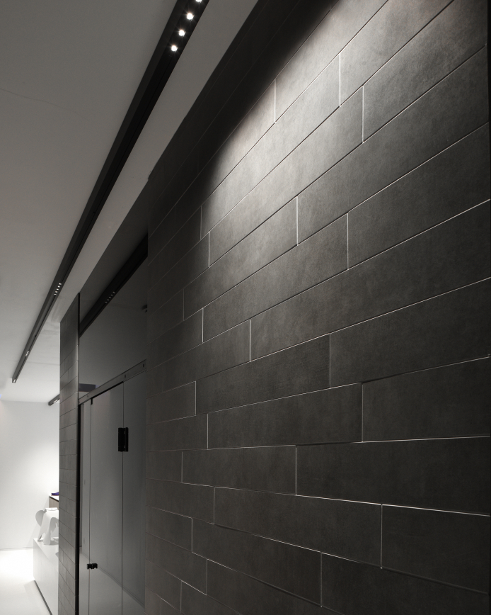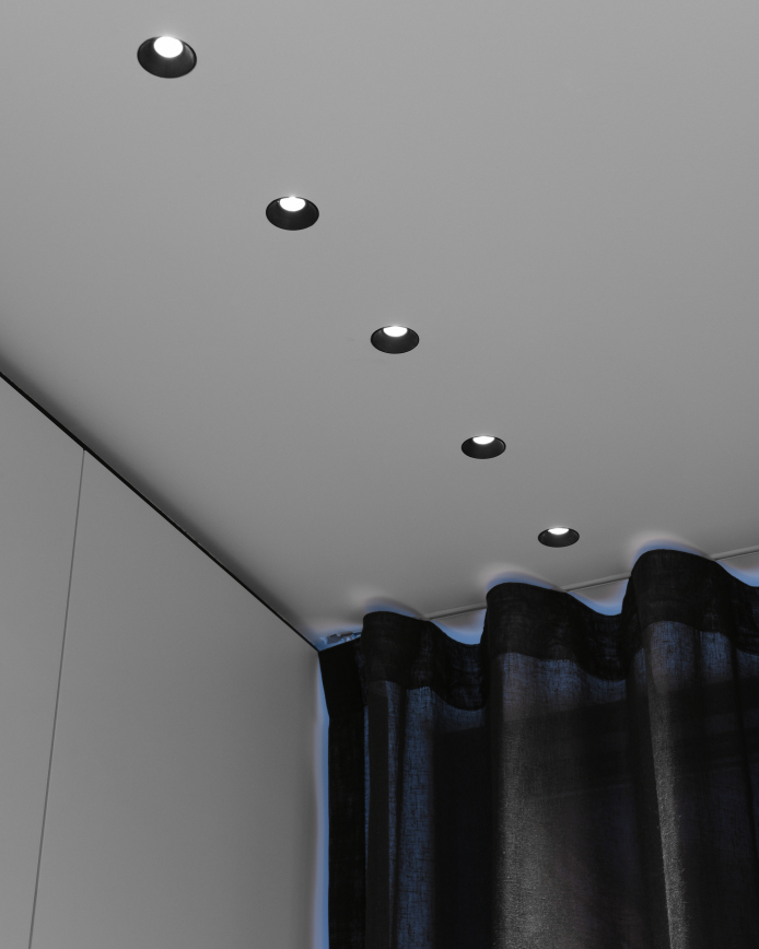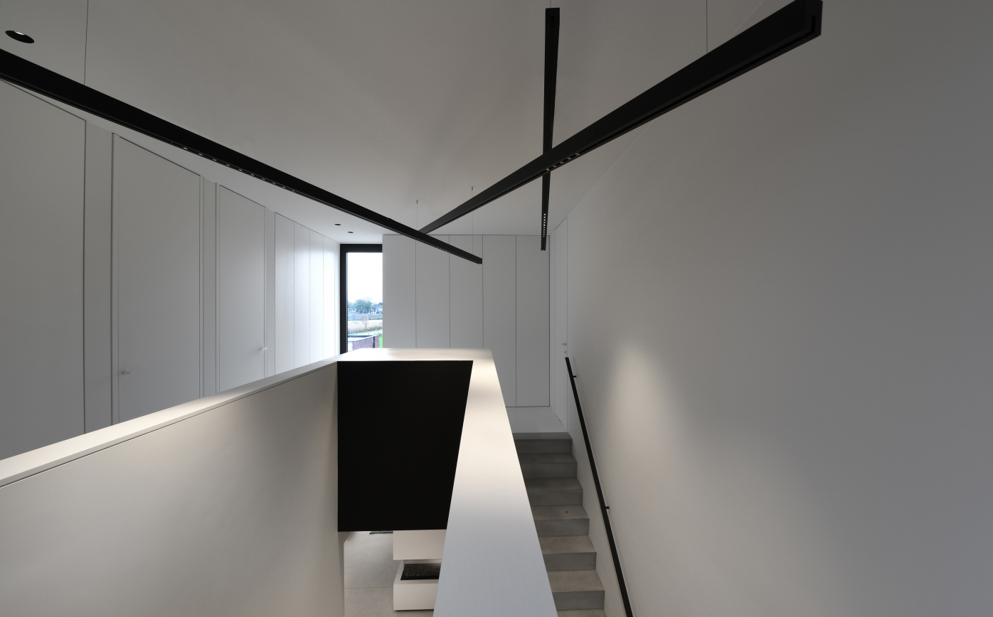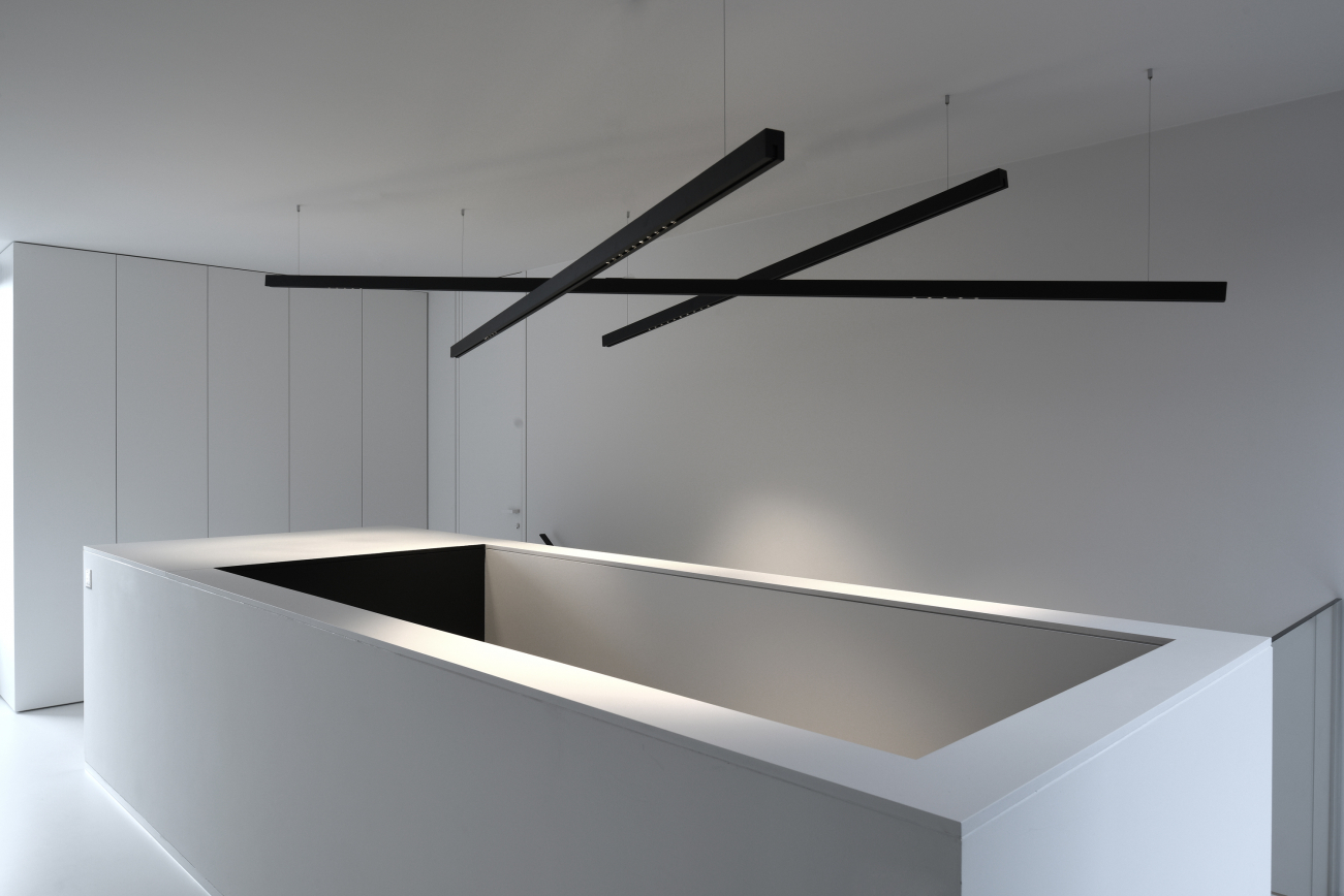 In this rigorous modernist villa in the northern Belgian town of Maaseik, architect Raf Segers chose lighting by kreon to integrate seamlessly into the super slick interior. The cylindrical Holon fittings appear as minimalist ceiling-mounted sculptures while the Aplis In-Line fittings all but disappear into the ceiling itself. The right-angled rod sections of the Nuit tracks are inset to ceilings of kitchen and hallways, but composed as a suspension mobile stye chandelier in the stairwell. The overall effect is of light as an architectural component in and of itself.