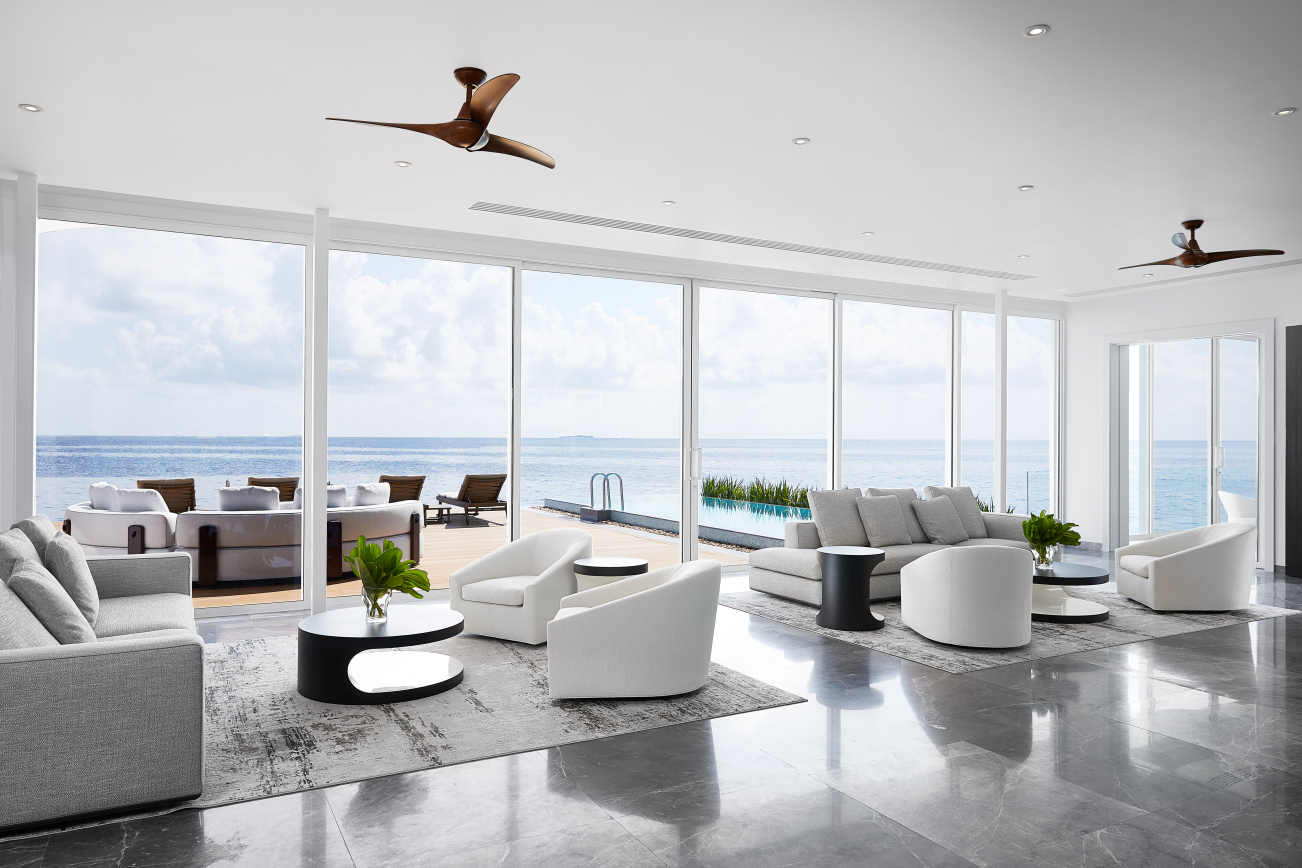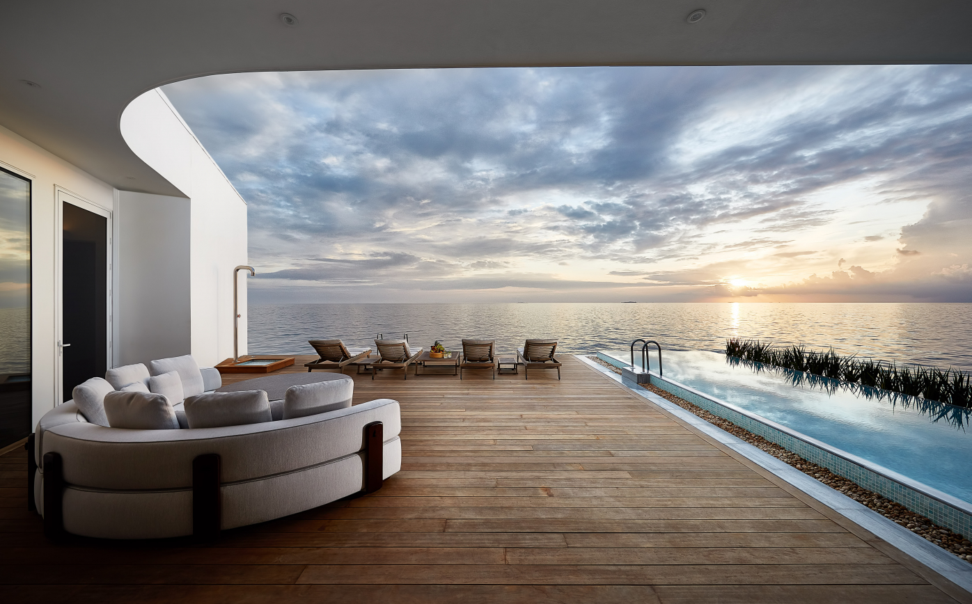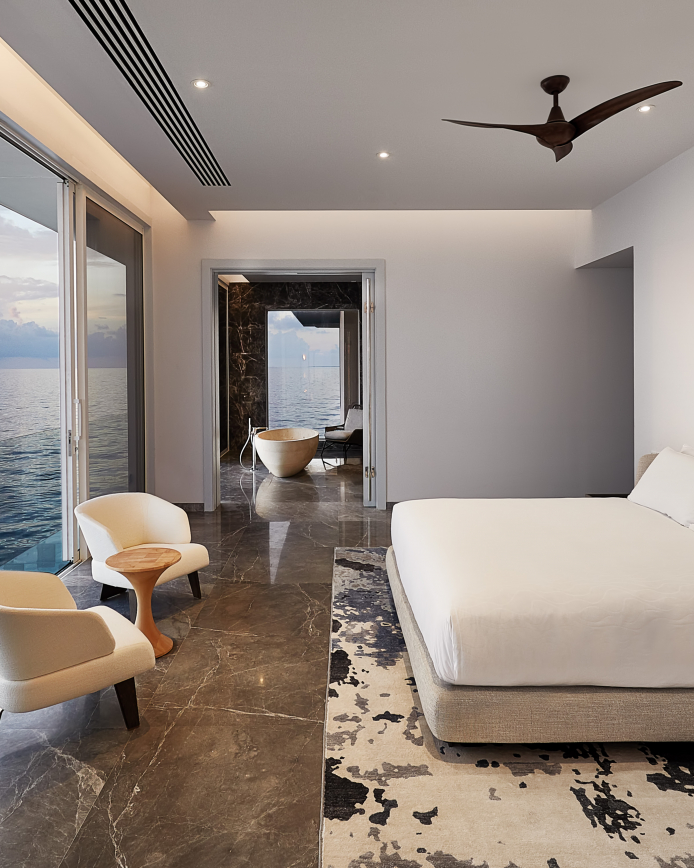 The residence spans two levels and includes two bedrooms, bathrooms, a living and dining room, a relaxation terrace with infinity pool and a panoramic pier. With a dedicated underwater level this exclusive residence is different from any other. In fact, at a depth of five metres, a bedroom with glass walls affords guests a breath-taking 180° view. Next door is a sophisticated lounge area hosting a pair of Portofino armchairs paired with a Benson coffee table.