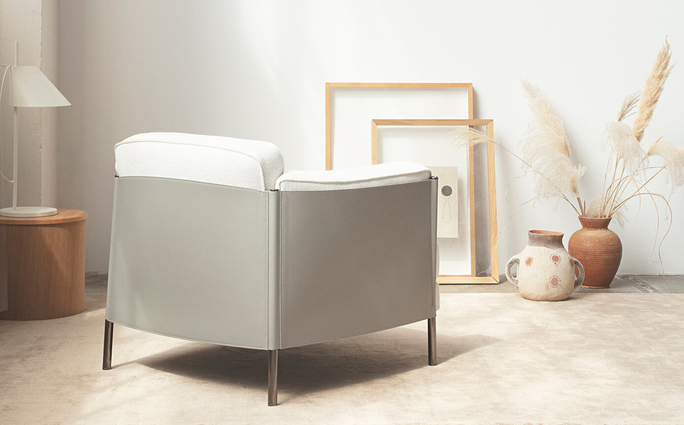 The studio’s new Fynn collection for Minotti continues a collaboration that includes the Shelley chair, a design that contrasts the structural shell formed by the leather against the soft upholstered interior.